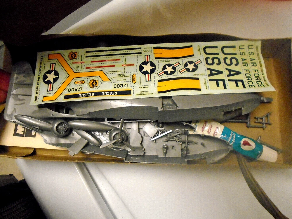 Here is a vintage 1967 released MONOGRAM manufactured plastic aircraft model kit. The awesome U.S.AIR FORCE ,GRUMMAN "HU-16B ALBATROSS Rescue plane" . Box has much 'shelf wear'. The kit is 1:72nd scale Personnel figures, operating landing gear and a Lifeboat plus untouched water slide decal sheet and instruction sheet ARE PRESENT. A pilot glued in position and a prop installed are the only parts 'started' that I see. No painting has been attempted. All said, perhaps you would like to add this classic kit to your WW 2 Military aircraft model collection. Thanks for looking !