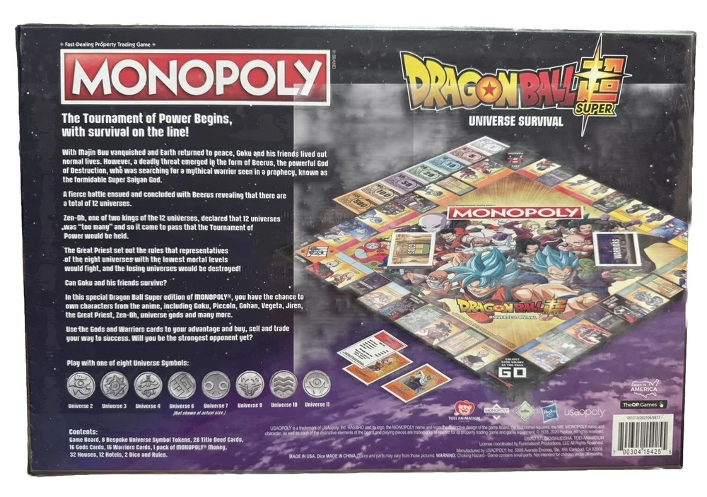 Theme: Dragonball Z Year: 2020 Min. Number of Players: 2 players Age Level: 8-11 Years, 12-16 Years, 17 Years & Up Gender: Unisex Country/Region of Manufacture: United States Recommended Age Range: 8 to Adult Brand: Hasbro gtin13: 700304154255 UPC: 700304154255 Features: Dragon Ball Z Game Type: Board Game Type: Game Board Character Family: Dragon Ball Z Game Title: Monopoly Dragon Ball Super Universe Survival
