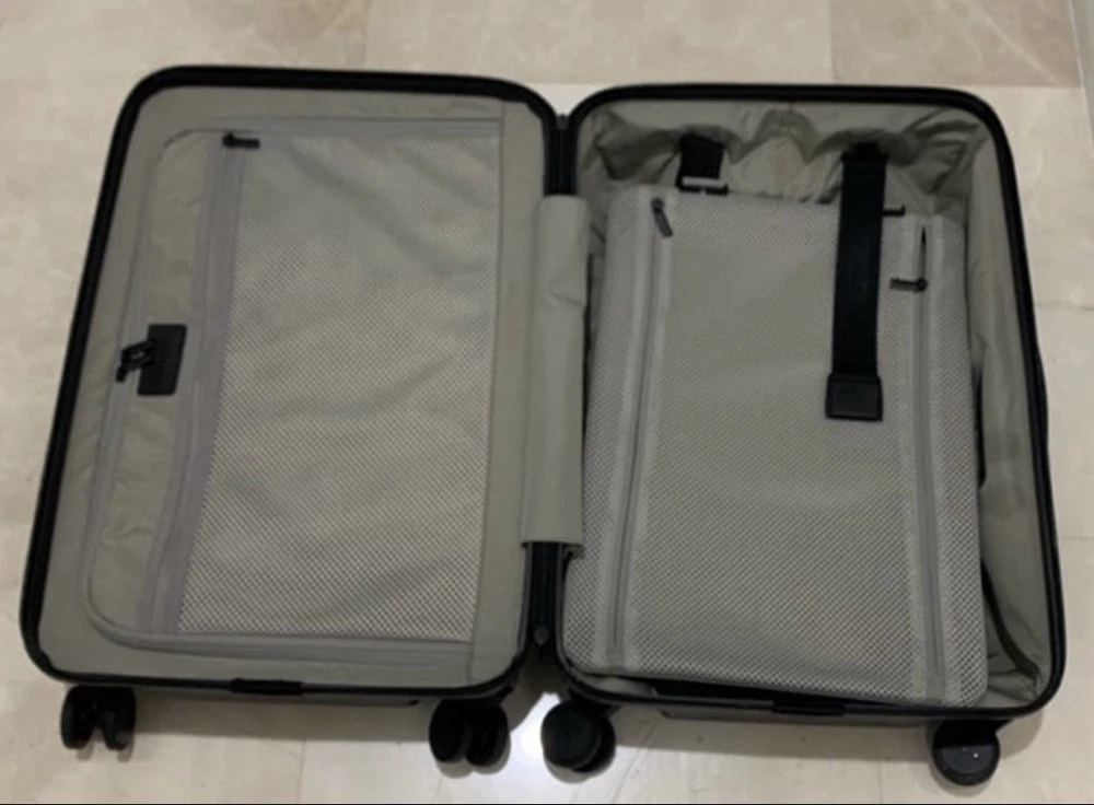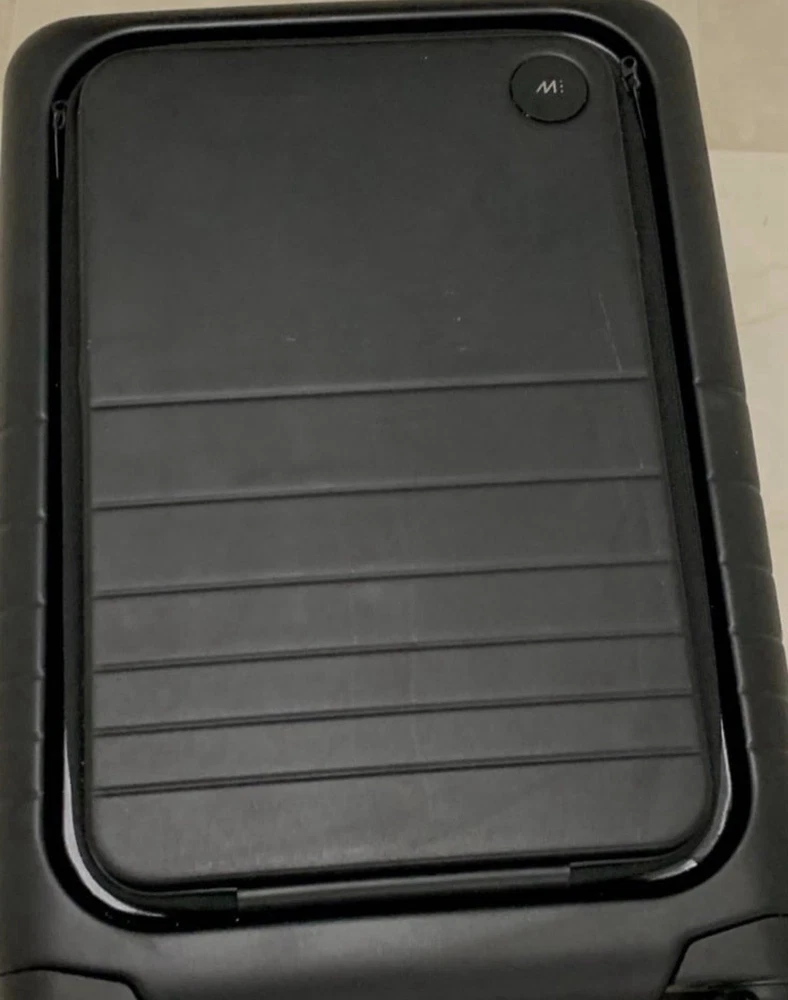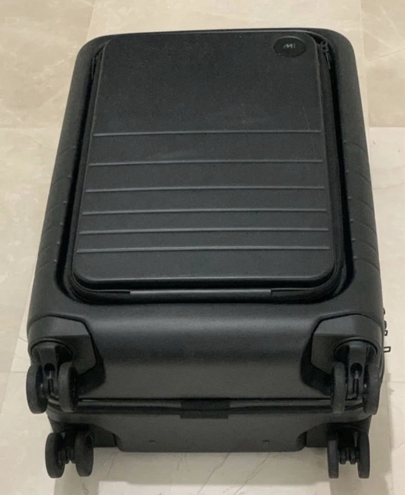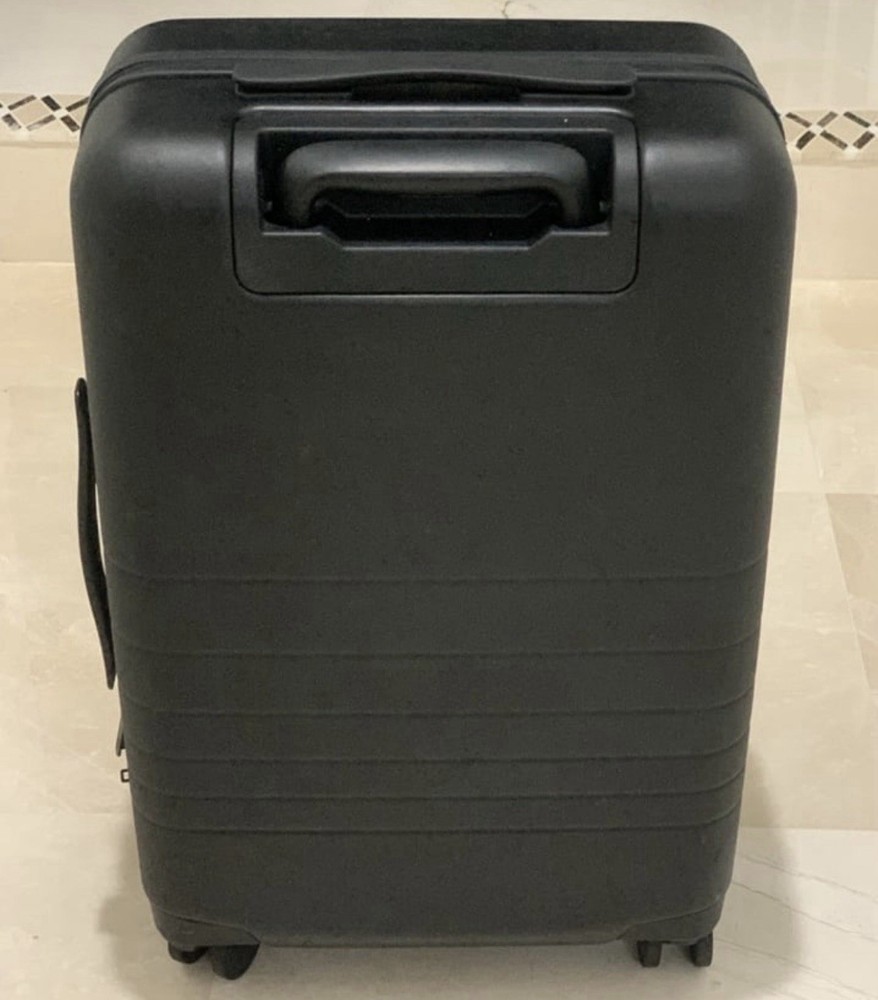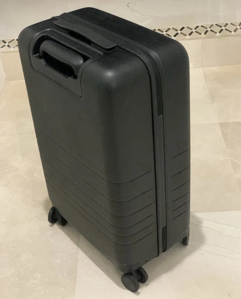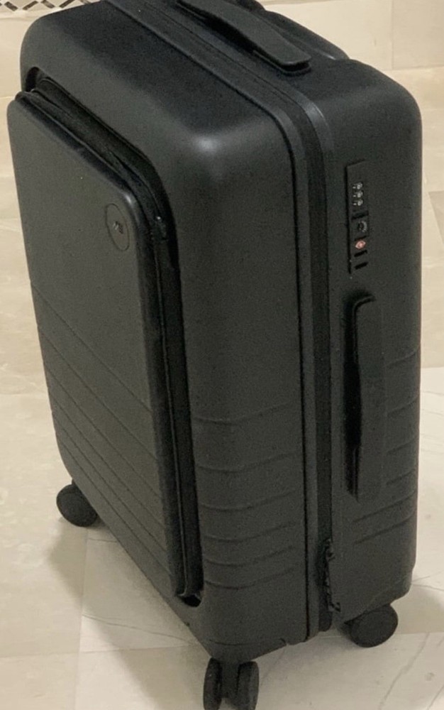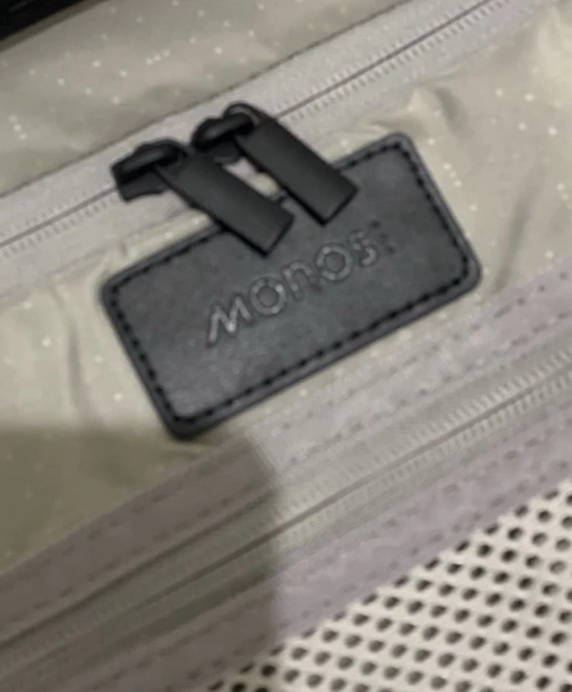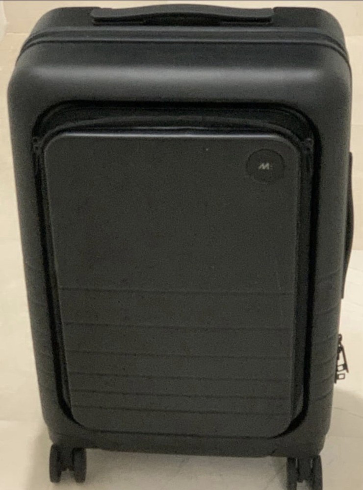 Monos 23-Inch Pro Plus Spinner Luggage This bag must be checked during air travel. Measurements include wheel and fixed handles. 23"H x 15"W x 9½"D. 8.38 lb. Pre owned in good condition. There are some minor scratches and spots, please see pictures.