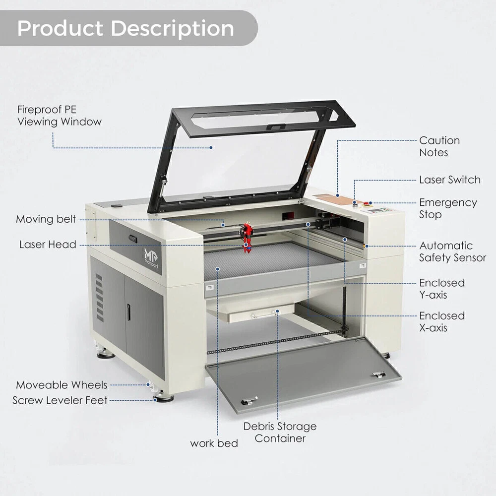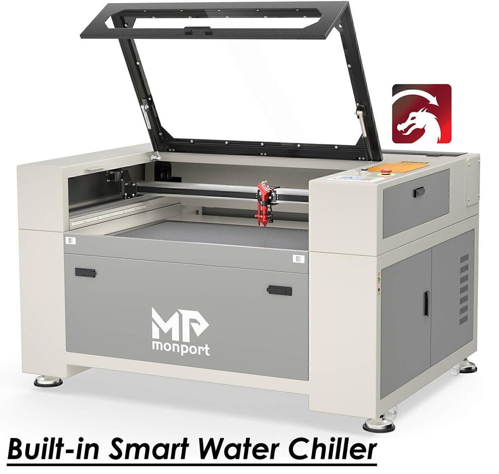 Monport 90W 36x24 Autofocus CO2 Laser Engraver Cutter Built-in Smart Chiller New Official Monport Upgraded 90W CO2 Laser Engraver&Cutter Built in Water Chiller, 24x36 Larger Working Area with Autofocus&Autolift, Digital Controls, Red Dot Pointer for Marker Wood Acrylic Glass More US STOCK CE & FDA Specification ⭐️ Dimension & Specifications Working Dimension: 24"x 40" ( 60 cm x 100 cm ) Pass-through Dimension:2.9'' x 43''(7.5cm x 109.5 cm ) Machine Dimension: 61'' x 43'' x 35'' ( 155cm x 110cm x 90cm) Max Engraving Speed: 800mm/s Max Cutting Speed: 30mm/s ( actual speed depends on material ) Max Engraving Depth: 19.05mm Min Engraving Depth : 0.01 mm Focal Lens Diameter: 18mm Mirror Diameter: 25mm Max Z-depth: 7" Package Dimension: 67.7" x 48.4" x 43.7" ( 172 cm x 123 cm x 111 cm ) Net Weight: 639.3 lbs ( 290 kg ) ⭐️ Material Capability Can safely engrave or cut any laser-compatible material Wood, glass, acrylic, fabric, leather, paper, cardboard, rubber Contact us with questions on specific materials not listed. If necessary, we can test it for you ⭐️ Software Works on Windows XP, 2000, Vista, WIN 7, 8, 10 & 11, both 64 & 32 bit MacOS (Version 10.11 and higher) ONLY with LightBurn software Compatible with Lightburn, RDWorks, Coreldraw, Auto-CAD Supported image formats: BMP, HPGL, GIF, JPG, JPEG, DXF, DST, AI and others ⭐️ Laser System Laser Wavelength 10640 nm; Rated at over 90 watt; Recommended engraving speed: 100 - 500mm/s Recommended cutting speed: 1 - 30mm/s (actual speed depends on the thickness of material) ⭐️ Mechanics Linear System — Enclosed aeronautical aluminum rails Motion — Equipped with stepper X, Y, Z axis, plus mechanical limit switches Cooling — Built-in 4L water chiller with two operating modes Air Assist — Built-in air assist with no external compressor required Ventilation — On-board exhaust fan, as well as an exhaust hose so you can vent the fumes to the outdoors Standard 110V , AC power connection 4-pin port connection for rotary axis devices Temperature-- Recommended Operating Temperature: 60-104 °F (16C-40C). Attention: the CO2 water temperature must be maintained at 60-70°F (16-21°C) Monport 90W Benefits ⭐️【FIREPROOF VIEWING WINDOW】 This viewing window is made from special fire-resistant polyester with iron frames. The melting point of this polyester ranges from 432° to 488° and the ignition temperature of it is over 1000°, which can dramatically decrease the possibility of fire accidents caused by the heat of laser burning the materials. ⭐️【BUILT-IN SMART WATER CHILLER 】 The built-in 3L water chiller is easy to operate and cools down the temperature without any other machines. To meet different needs, there are two cooling modes, constant and intelligent temperature modes. This professional water chiller has multiple warning protection mechanisms such as an alarm for ambient temperature, an alarm for overheated/overchilled water temperature, and so on. When the alarm occurs, the display will alternate between the water temperature and the error. ⭐️【ENCLOSED AERONAUTICAL ALUMINUM RAIL】 Equipped with X and Y stepper motors, this rail features efficient power transmission with high precision. The enclosed rail is designed to avoid smoke and debris and prolong the service time of rail units. ⭐️【LASER PROTECTIVE GLASSES FOR FREE】 Lasers emit radiation in the invisible form of light. This pair of laser protective glasses is certified to protect your eyes against radiation damage by looking at the class 4 laser in any way (directly, indirectly, or even looking at the laser dot on a surface can damage your eyes). ⭐️【RUIDA DIGITAL CONTROLLER】 Whether your chosen software is LightBurn, RDworks, AutoCAD, or CorelDRAW, this Ruida digital controller can support the given platform. The Ruida Controller with a digital display can control the laser head, start or stop projects, adjust laser power and speed settings and so on. 90W CO2 Engraver Features ⭐️ High Speed and Resolution The Engraving Speed is up to 800 mm/s; The Cutting Speed is up to 400 mm/s; The Resolution is up to 4500 dpi; 3 LED light strips above the work bed provide illumination for precision; 2.0" Focal distance provides high resolution and etching of tiny fonts ⭐️ Autofocus Use the control panel to correct the focus automatically at the touch of a button — no more manual testing and adjustment. ⭐️ Built-in Air Assist A built-in air assist system guides a pressurized air stream through the laser head nozzle to displace debris, heat, and combustible gases from the engraving surface and laser beam path, keeping engravings more precise. ⭐️ 3-ways to Connect with PC End Two USB ports provide options including flash drive connectivity and a USB-to-USB PC connection. In addition, one ethernet port is also available for connection. ⭐️ Red Dot Guidance The red dot shows the laser head position, marks the working path and frames the project sizes, assisting you with more convenience and guidance. ⭐️ Automatic Safety Sensor The safety shutdown sensor helps stopping the machine even if the window cover is on. Once closed, press the “Enter" button to continue operation. COMPATIBLE COMPUTER SYSTEMS ADVANCED FEATURES Buitl-in Smart Water Chiller The built-in 3L water chiller is easy to operate and cools down the temperature without any other machines. More space-saving and convenient Ruida Control Panel The RUIDA Motherboard and intuitive RD Control System is easy to use and offers advanced capabilities. Compatible with third party software like LightBurn and AutoCAD. Enclosed Aeronautical Aluminum Rail & Autofocus The enclosed rail is designed to avoid smoke and debris and prolong the service time of rail units. Use the control panel to correct the focus automatically at the touch of a button — no more manual testing and adjustment. Autolift Platform Raise or lower the workbed easily using the control panel's Up & Dow