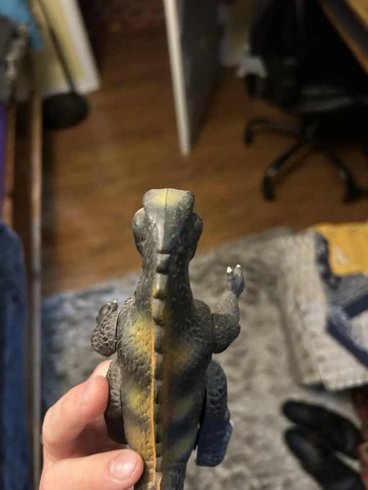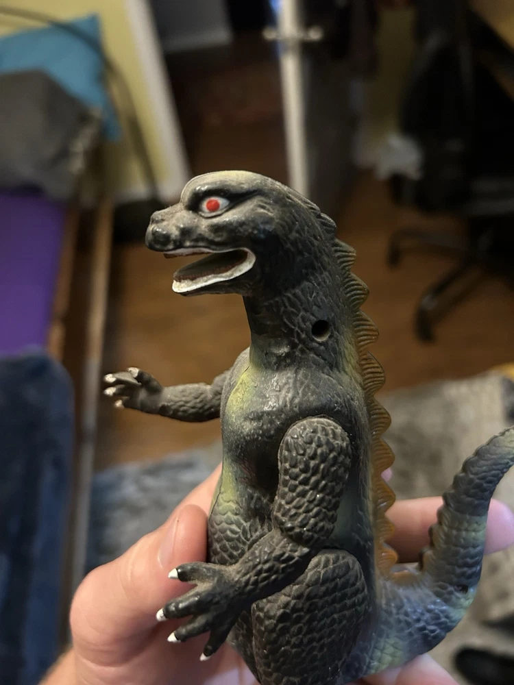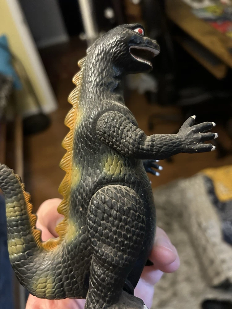 This vintage, Godzilla pull toy, pull action figure is a rare and hard to find peace. I do not have the original box, but everything on the toy does still function. The pullback function does still work and it does show normal signs of where for vintage age and does have a few spots of color loss on the white fingertips and white tips of the toes, but other than that, it is still in great shape. This would be an excellent addition to any collection. Please zoom in on photos and please ask any questions that you might have before purchasing. Payment is due at time of purchase, all items are sold as is and all sales are final. No returns accepted.