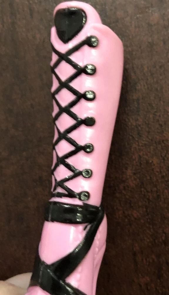 Step up your Monster High collection with the Frightfully Tall Draculaura boots! These striking pink and black shoes are the perfect accessory for your favorite fashion doll, designed to fit 17-inch Monster High dolls like Draculaura Fang. Crafted from durable plastic, they capture the essence of the goth-inspired style that fans adore. The boots feature an original design from Mattel's popular Monster High product line and are an ideal addition for collectors and enthusiasts alike. Whether dressing up for a special occasion or adding to a display, these shoes bring a touch of spooky-chic to any Monster High character's wardrobe. Single replacement boot. Right boot. Preowned