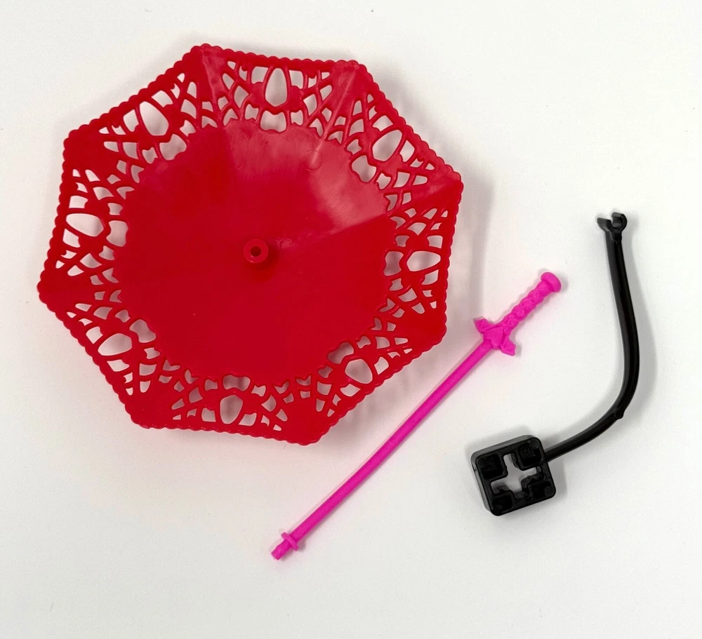 Monster High Howliday Love Edition Draculaura Doll Outfit Accessory Umbrella & Mounting Clip ONLY NEW - Carefully Unboxed and Undressed - Never Played With - No Packaging - PLEASE NOTE - Includes umbrella & mounting clip attachment for doll stand but does Not Include Doll Stand Headless doll and stand shown for display purposes ONLY and not included in sale Designed to fit Monster High G1 Body Style Draculaura and might not fit all other body style dolls There are marks discovered when removed from the package & undressed Though removed from new in box doll manufacturer flaws are still possible Photos are my personal stock photos and an example of the item but the item the buyer receives might be slightly different due to variations in the manufacturing process and painting Listing is for Doll Umbrella & Mounting Clip ONLY There is no doll, stand, other clothes & accessories, paperwork or box included in this listing - Please Note - Doll shown for Display Purposes ONLY and NOT Included in Sale This is definitely a MUST HAVE for all Monster High Collectors!! Please check out my other NEW TOY listings!! Now for the Fine Print Shipping Info $6.95 S/H in the lower 48 Continental United States ONLY Payment Info Payment expected within 4 days from end of listing! Buyer's Info Read ENTIRE description and ask ALL questions BEFORE bidding If an item is returned, it is done at the Buyer's Expense and o riginal S/H is not refundable