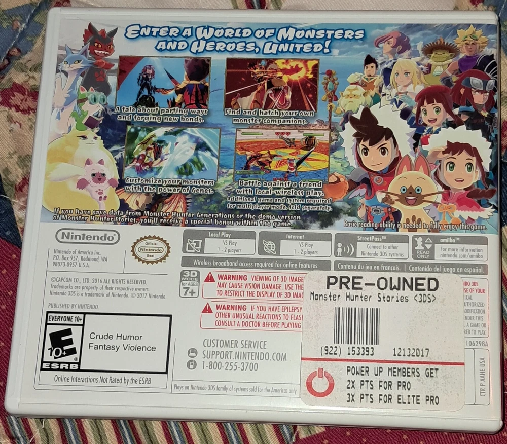 Rating: E10+ (Everyone 10+) Genre: Role Playing UPC: 0045496591151 Publisher: Capcom Game Name: Monster Hunter Stories Release Year: 2017 Platform: Nintendo 3DS Region Code: NTSC-U/C (US/Canada) gtin13: 0045496591151