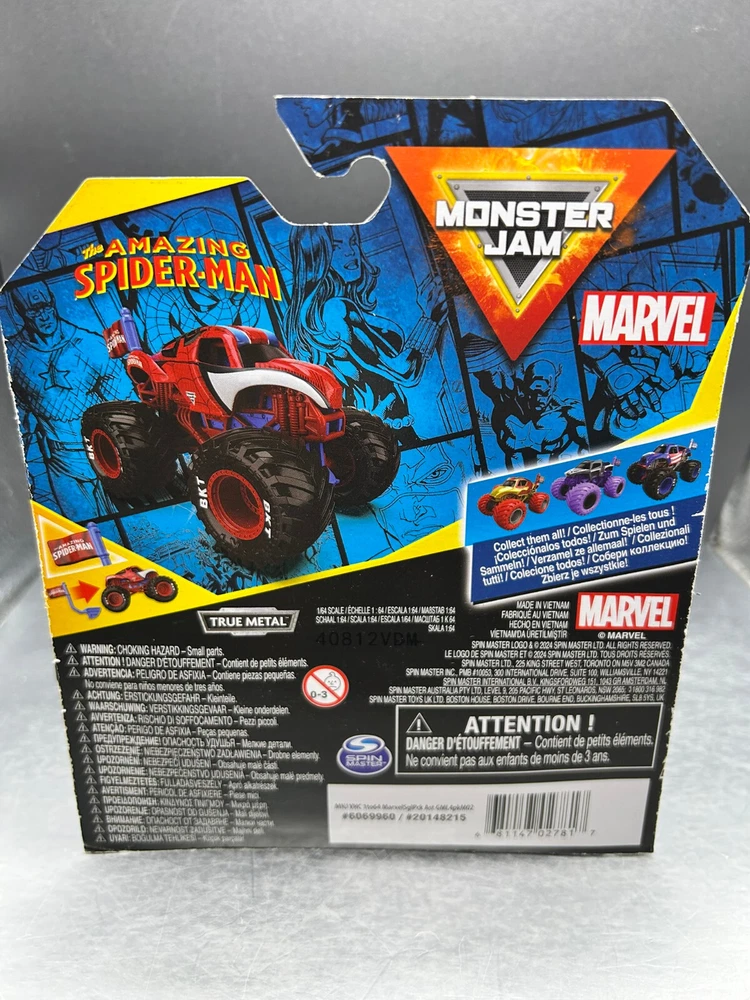Capture the thrill of Monster Jam with this exclusive "The Amazing Spider-Man" diecast model. This 1:64 scale replica embodies the vibrant essence of the iconic Marvel character, boasting striking red, blue, and black colors that are sure to stand out in any collection. Designed for fans of all ages, from 3 years to adults, it's a versatile addition that brings the excitement of the arena right into your home. Marvel enthusiasts and diecast collectors alike will appreciate the intricate details that reflect Spider-Man's legendary status. This special edition model, part of the Hot Wheels Marvel series, is a must-have for those who celebrate the superhero's legacy or anyone who admires the art of finely crafted vehicles. Proudly manufactured in Vietnam, it's a non-autographed piece that captures the spirit of Monster Jam and the enduring legacy of Spider-Man. Thanks for your time!