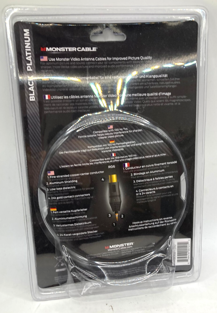 Monster RG6 Antenna TV Cable 1.5m Black Platinum Monster cable black platinum RG6 Antenna Cable designed for high quality picture and sound. Features dual-layer shielding to protect against signal interference and gold-plated connectors for enhanced signal transfer and corrosion resistance. New and sealed.