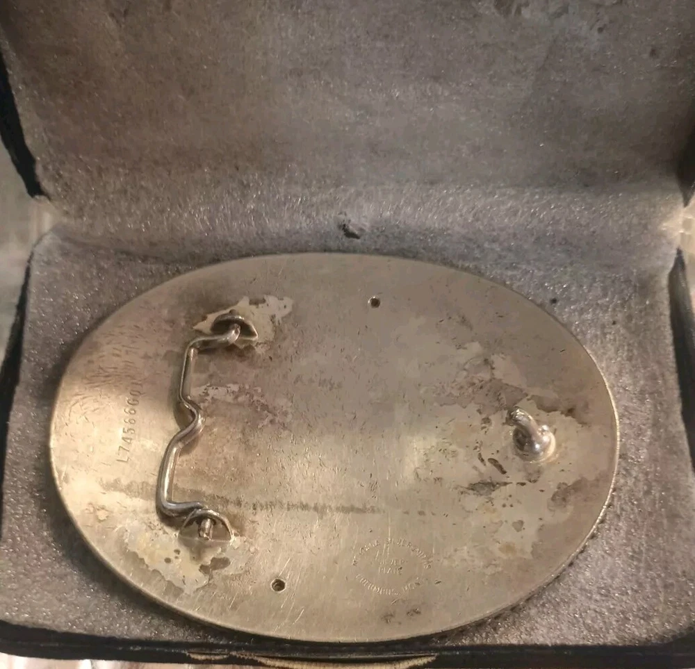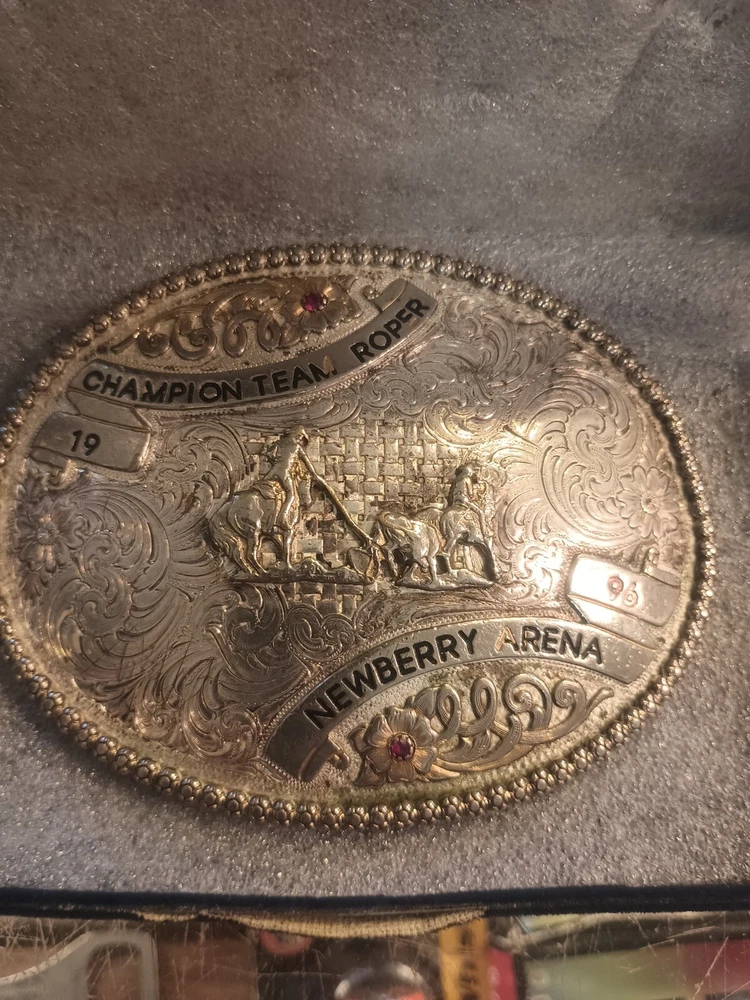The Montana Silversmiths Large Oval Team Ropers Belt Buckle from 1996 features a western style design with a theme of Western. Made of Gold & Silver Electroplating, this belt buckle is designed for men and fits belt widths of 1.75 inches. Crafted in the United States, it showcases a high-quality construction suitable for those seeking a classic western accessory. The belt buckle is adorned with intricate detailing, making it a stylish and unique addition to any cowboy's wardrobe.