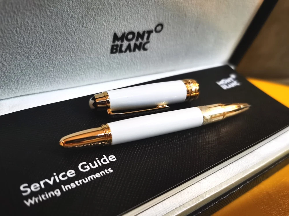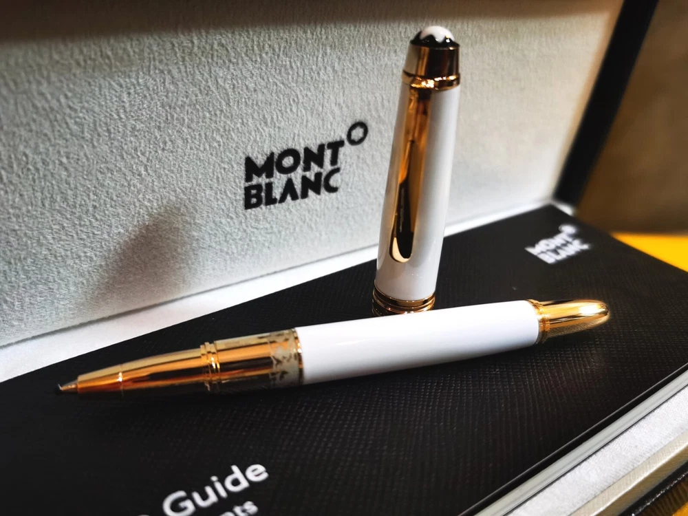 Now THIS is an amazing writing utensil for that successful, special person. Presented here is this Authentic Montblanc Meisterstuck White Gold Classique Trim 163 Rollerball mini 4.5"Pen Made In Germany This luxury writing instrument is created with a Precious Resin Barrel and Cap with Platinum Plated Rings, Fittings and Clip. The pen measures 4.5" in length and has a Silver document proof ink cartridge. One platinum-plated ring is engraved with a serial number while another is engraved with "Montblanc Meisterstuck Pix" with "Made In Germany" under the clip. This pen will be shipped in its Montblanc gift box with its Service Guide booklet.