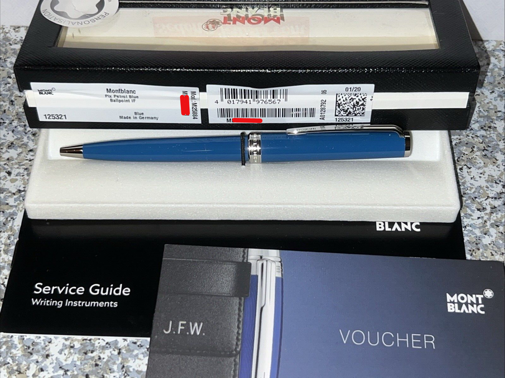 SEALED Flight Box - MONTBLANC Pix COY Petrol Blue IF Ballpoint MB125321 125321 Includes service guide and voucher for personalization. Ideal for those that prefer a more slender instrument, the Pix meets the occasion. The cap top is crowned with the white Montblanc emblem. Sleek, understated elegance that was inspired by the purity of Bauhaus design Architecture movement and named after the historical Coolpix trademark. Coy petrol color is ambitiously collected and very difficult to locate in mint condition SEALED flight box. Experience the SedonaJewels difference . . . WHITE GLOVE SERVICE EXPERIENCE PROVEN 25+ YEAR HISTORY INTERNATIONAL SHIPPING FOR MONTBLANC SHIPS USPS PRIORITY WITH SIGNATURE CONFIRMATION DOMESTIC - Overnight shipping is not available. USPS Priority 2-3 day mail is our only option. Multiple purchases made at the same time will be combined into a single shipment for US buyers only. INTERNATIONAL - We are in the eBay International shipping program, combined shipping is not available. We ship first to the eBay HUB. Next, eBay handles customs forms & re-ships to you using your selected final shipper. ‘Arrive by dates' cannot be guaranteed for international deliveries. TAXES & CUSTOMS - Taxes are non-negotiable before or after a sale. Above the sold price the buyer is responsible for VAT, customs fees & any additional taxes which are mandated by the tax authority in the buyers location. We cannot provide false valuations on invoices or customs forms to reduce import fees. Please see all technical specs and sizings prior to purchase. If you have any questions we are always happy to help. All sales on Montblanc are final - we do not accept returns.