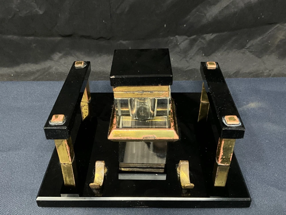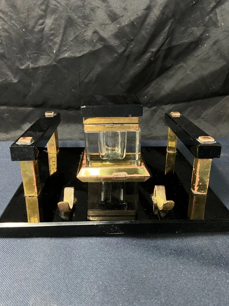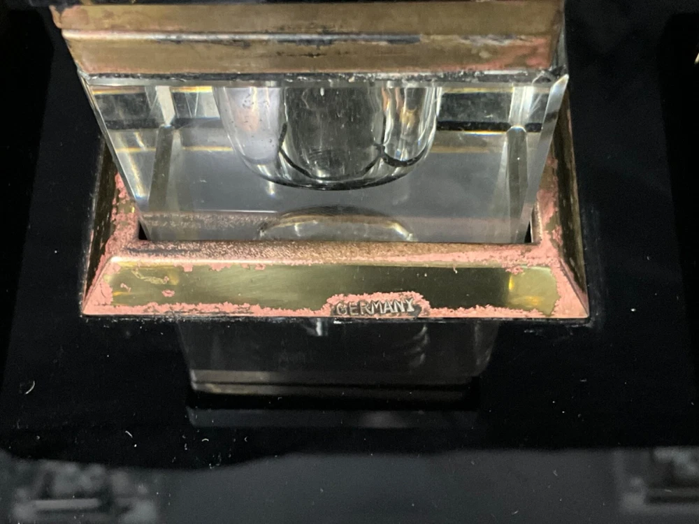 Black onyx crystal inkwell. Piece came from retired Pen Shop. Inkwell appears to be in made by Montblanc. There are no makers marks present (only GERMANY ). Therefore in style of Montblanc. Piece shows wear. Oxidized brass can be seen. Crystal inkwell shows 2 spots with chips (see pictures). Onyx lid also shows 2 chips, some haziness can be seen on the surface. Measures approx 6.25” x 5.75” x 3.5”. Marked on the brass “Germany”. Great Christmas present for any collector , gift for lawyer attorney , young student , father , husband.