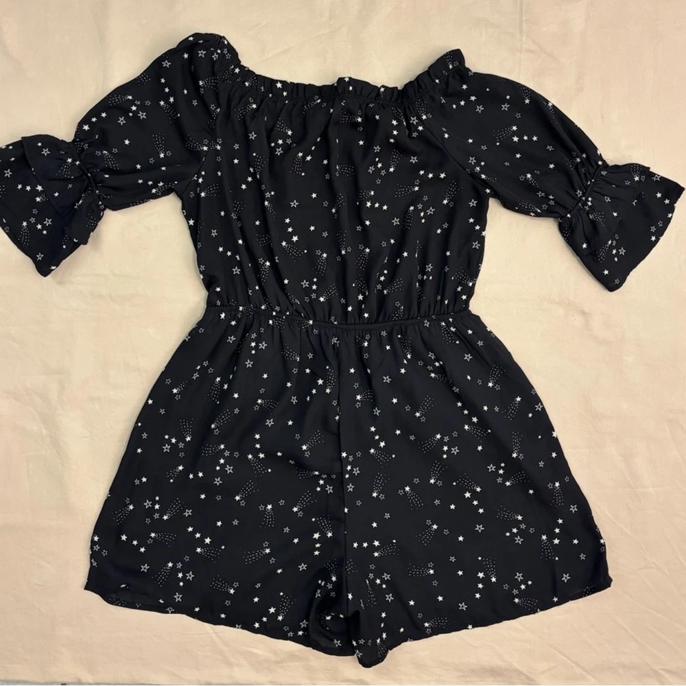 Monteau Women's Black and White Off the Shoulder Stars Romper Size XL Used, excellent condition. Lined. Could be worn on or off the shoulder. Elastic neckline. Short, fluttery elastic sleeves. Approximate measurements shown in photos.