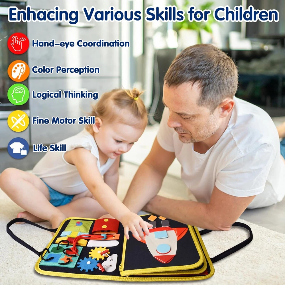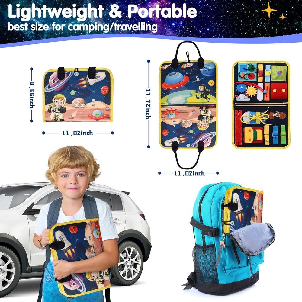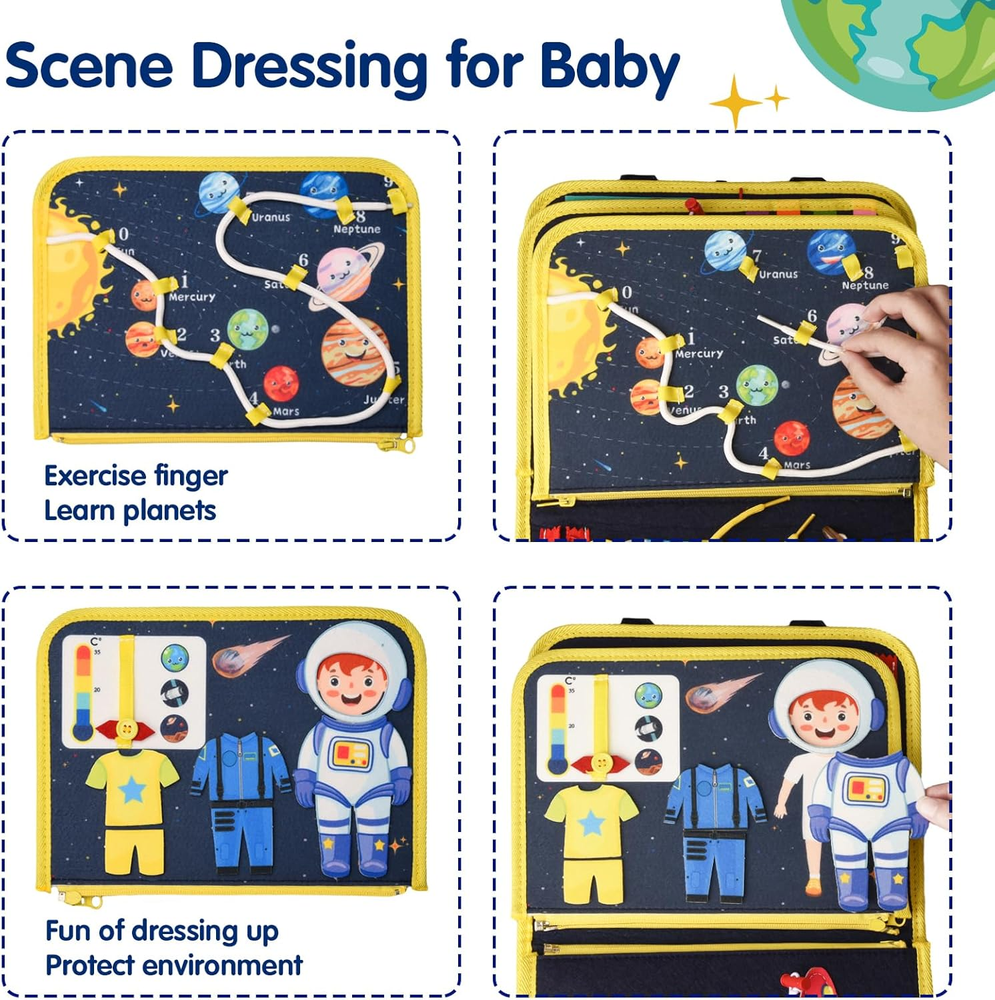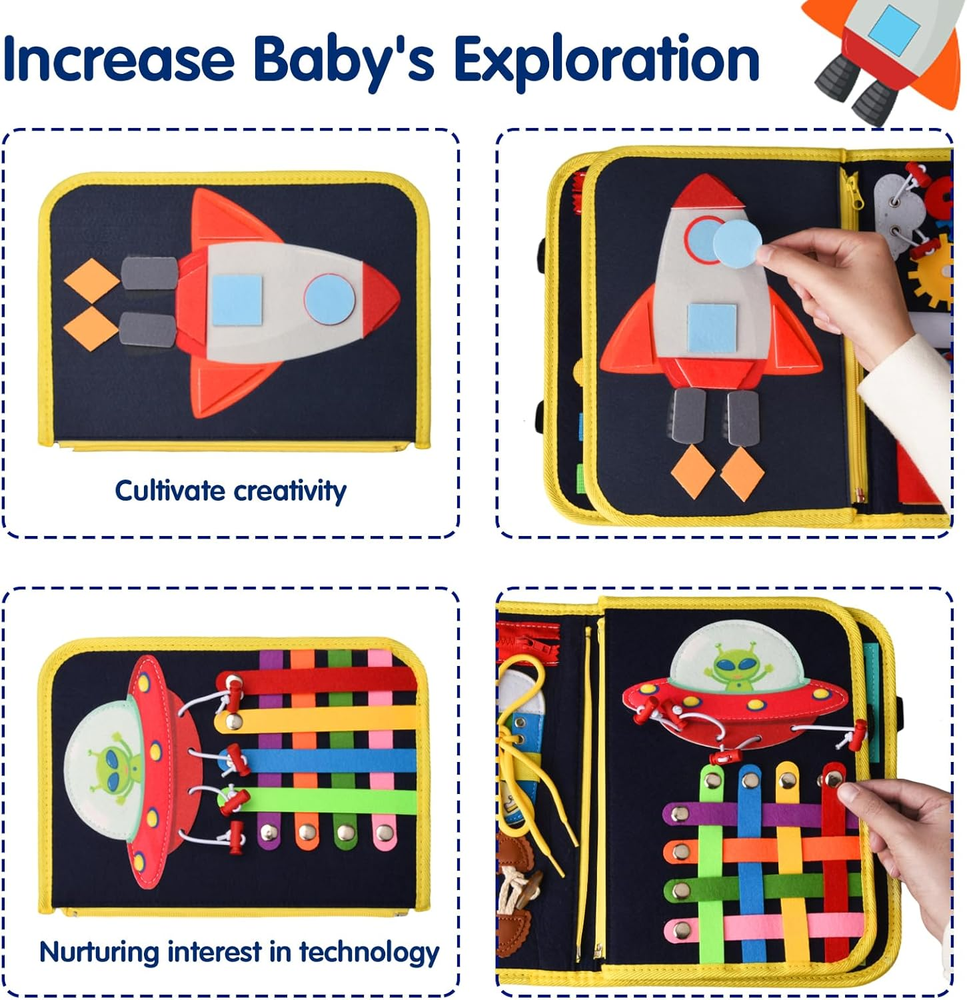 Montessori Busy Board for Toddlers 1 2 3 4 Year Old Boys & Girls, STEM Sensory Toys with Cosmic Exploration Activities Educational Travel Game Busy Book for Fine Motor Skills & Birthday Gift SOFT & SAFE: Safety is our TOP PRIORITY. All Ancistro Busy Books are certified by ASTM , CPSIA and CPC, ensuring they are safe and child-friendly. The busy book are made of soft felted wool and high-quality ABS material, ensuring strength and durability for regular play. They are soft yet sturdy, providing a safe play experience. PRACTICAL UPDATE: After comparing the montessori busy boards for 1 years old kids on the market, we’ve made a lots of upgrades on the Space theme busy board: GALAXY EXPLORATION BOARD can greatly enhance your baby's imagination and hand-eye co-ordination, WEARING AND TEMPERATURE page improve recognition and Toddler can learn fine motor skills through the PULL CORD and BUTTON. 6 IN 1 LEARNING BOARD: Our montessori toddler busy board has 6 major skill learning boards, including 62PCs Learning Accessories. No need to worry about how to teach your baby various skills systematically, because we’ve collected most of the basic life skills and knowledge in this sensory board. FINE MOTOR SKILLS DEVELOPMENT: Designed for fun and educational time, this Montessori toy offers 25 sensory activities such as tying shoelaces, buttons, buckles, and zipper pulls. It enhances practical life skills, fine motor skills, problem-solving abilities, logical thinking, and hand-eye coordination. As a great quiet time toy, It's very suitable for use in cars and planes , offering relief for parents. NICE GIFT : Ancistro Busy Book for Toddlers 1-3 is a Good Baby Gifts Idea. Toddler Toys Age 1-2 are suitable for all kinds of holiday gifts, including Birthday gifts, Easter gifts, Christmas gifts, New Year gifts etc. Please don't miss any chance to surprise your babies! Product Description All New Design - Tons of Activities for Kids to Explore and Have Fun Upgraded design with tons of activities that can keep baby busy and improve their motor skills, logical thinking skills and other learning skills such as practicing getting dressed. It’s a great learning & educational toy for toddlers that teach them about alphabets, numbers, colors, shapes, animals, clock, date etc. 100% screen-free, no apps, no screens, just a good learning toy for hours of fun! Our busy board is designed to engage your kids in the joy of imaginative and hands-on play. Designed for fun and educational time, this Montessori toy offers 25 sensory activities such as tying shoelaces, buttons, buckles, and zipper pulls. It enhances practical life skills, fine motor skills, problem-solving abilities, logical thinking, and hand-eye coordination. As a great quiet time toy, It's very suitable for use in cars and planes , offering relief for parents. Nice Gift Ancistro Busy Book for Toddlers 1-3 is a Good Baby Gifts Idea. Toddler Toys Age 1-2 are suitable for all kinds of holiday gifts, including Birthday gifts, Easter gifts, Christmas gifts, New Year gifts etc. Please don't miss any chance to surprise your babies! Item model number 1111 Color Deep Blue Product Dimensions 11 x 8.5 x 1.8 inches Country of Origin China Item Weight 11.7 ounces Manufacturer recommended age 18 months - 3 years 8.5 inches x 11.0 inches x 1.8 inches. Weight: 11.7 oz Shipping from the USA All of our products are shipped from the USA, ensuring quick delivery to your destination. Payment We offer the following payment methods: PayPal, credit card, bank transfer, and eBay's secure payment system. Free Shipping & Free Returns Shipping within the USA is FREE. Additionally, any return is absolutely free for you. Risk-Free Purchase You have the option to return an item within 30 days without any justification. We cover the return shipping costs! Fast Shipping We ship immediately upon receipt of payment. Generally, the package is delivered within 2-3 days in the USA. If it takes longer, we will contact you. Quality and Costs Made in Europe, USA, China No customs fees or additional charges Total satisfaction guarantee Invoice with declared VAT available upon request in .pdf format Feedback Your feedback is very important to us. After you pay for your purchase, you will automatically receive positive feedback from us.