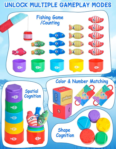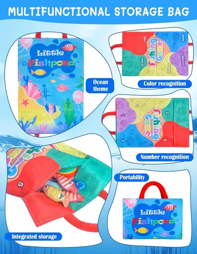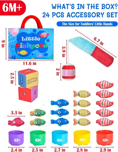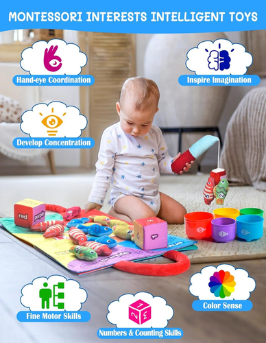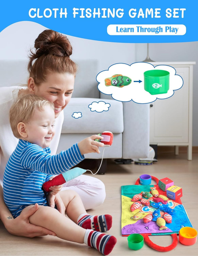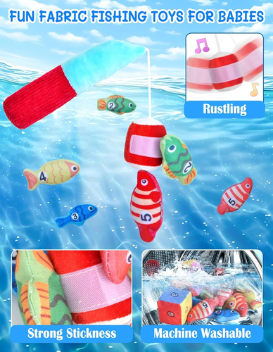 Montessori Toys for 1 Year Old, Cloth Fishing Game with Stacking Cups 24 Pcs for Toddlers 1 2 3, Sensory Toys for Kids Baby Shower Birthday Easter Gifts for 6-12 Months Girls Boys LuxeFusion Product Description Features Montessori Fishing Toy: Nurture your child's natural curiosity with Montessori-inspired magic! Set includes 24 pieces: a fishing rod, 15 pieces of felt fish, 1 number dice, 1 color dice, 5 pieces of stackable fish buckets, and an ocean-themed mat (also as a storage bag). Fishing rod can make a cheerful "ring-ring" sound when shaken to attract attention. Each piece invites baby's tiny hands to explore, learn and grow through joyful independence to complete their first fun fishing adventure Fun and Educational: More than a toy: A quiet classroom full of possibilities. Our Montessori Fishing Toys are designed to calm the busy fingers and focus the mind of young children in a unique and fun way. They can immerse your little ones in a realistic fishing experience, encourage imaginative play, and provide sensory stimulation. Our toddler fishing toys are suitable learning toys for 6-12 months babies and also nice birthday gifts for 1 year old boys or girls Multiple ways to play: Funny educational toy in many ways. Stacking cups could develop problem solving and spatial awareness; Matching the fish to the correct colored cup could develop color recognition skills; Rolling the dice could develop hand motor skills; Putting the correct number of fish in the cup could develop counting skills; And the different shapes of the cup bottom could help develop baby's recognition of graphics. Fishing game helps develop toddlers' hand-eye coordination Baby Shower Gifts / Easter Gifts: A suitable gift for 1 2 3 year old little ones, 10 11 12 months new baby, also nice for a new mom, new parents or expecting mom or dad as birthday gifts, easter basket stuffers, baby shower gifts, children's day gifts, christmas gifts, valentines day gifts and so on. Choose our fun and cute fishing toy gift to spark a baby's lifelong love of learning, helping children master real-world skills through play that feels like an adventure Safe Sensory Toys for Babies: Made of high quality soft fabric material and does not contain magnets and no small parts, which is durable and safe for babies. And with strong stickiness, the fish are easy to catch. The fishing rod, cloth fish and bag are machine washable (Note: Please use the laundry bag). Cute color sorting toy for infants 1-3, baby einstein toy, color sorting toy for infants 1-3, wonderful fishing toy for infants 1-3 Product Details Product Dimensions: 7.09 x 3.35 x 7.48 inches Item Weight: 12.6 ounces Country of Origin: China Manufacturer recommended age: 6 months - 3 years Manufacturer: Mikiwon 🚚 Free Shipping All orders ship free and fast to your doorstep. 🔁 Easy Returns Satisfaction guaranteed. 30-day returns, no questions asked. 💬 24/7 Support Contact us anytime; we’re here to help, day or night. Brought to you by LuxeFusion – Quality you can trust.