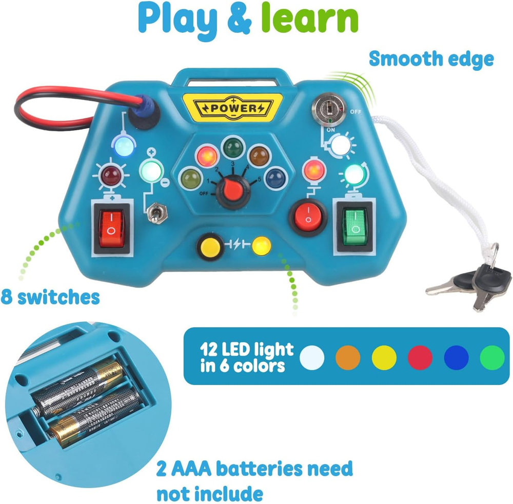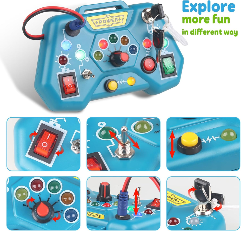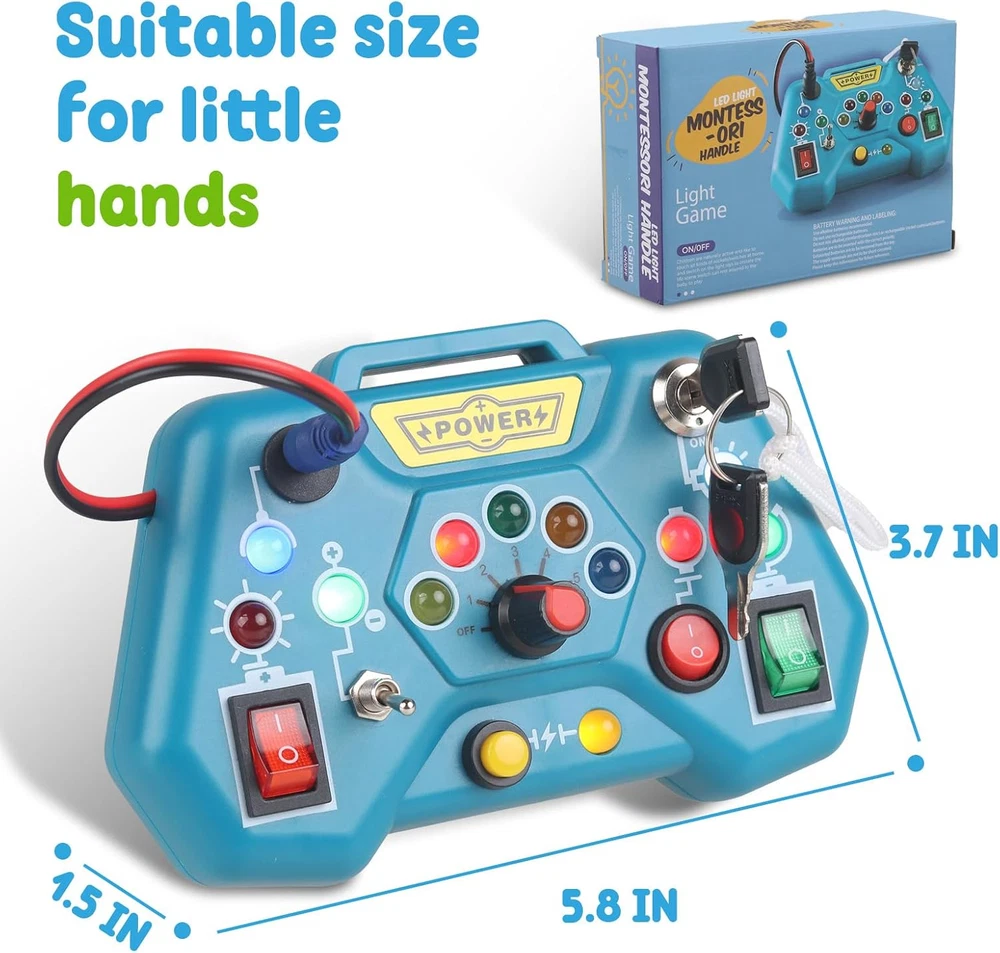 MONTESSORI TOYS - Our busy board for toddler boys and girls aged 1-4 years old features 12 LED lights and 8 light controls, each controlling lights of different colors, capturing baby's attention and enhancing their fine motor skills. Brightly colored lights add visual appeal while educating young children about color recognition, promoting cognitive development and focus LEARNING & SENSORY TOYS - This baby busy board has 6 different types of playing modes, a baby can turn the key, insert the wire, press the button, push the lever and other different operations to improve fine motor skills, and connecting the plugs to activate lights of matching colors. Sensory board helps babies develop their senses while fostering their creativity and imagination UPGRADED NEW TOYS - Susierwey learning toy unlike traditional hand-carved wooden busy boards, our toddler busy board are made from high quality ABS plastic the components, ensure that the connection between the parts and the main body is stronger and less likely to fall off. The toys are exquisitely crafted with rounded edges and corners to ensure your child's safety while playing, allowing your child to enjoy a worry-free play experience TODDLER TRACEL TOYS - With its convenient shape resembling a game controller, our infant toy is perfectly sized for little hands to hold. It serves as an ideal travel companion, keeping your toddler entertained for hours during long road trips in car or on plane SURPRISE GIFTS FOR TODDLER - Our busy board is an excellent gift for boys and girls aged 1-3 & 2-4. This toddler toys a world of interactive and educational activities for curious toddlers, Its simple yet captivating design guarantees extended periods of focused play. Great gift for baby's birthday, Easter, Christmas, New Year and other festivals! Product Description Montessori Toys Every toddlers age 1 2 3 4 years old always love in light controls. Our montessori busy board feature various light controls and lights,provides a world of sensory exploration and helps to develop babies fine motor skills and problem-solving abilities. Keep Toddlers Busy This baby toy is great for hand eye coordination, learning to push and turn buttons, keys and plugs. Also for teaching colors! Baby Travel Toys good size in the shapes like game controller for little hands,easy to hold,keeps toddler boys and girls entertained for hours on a long road trip. Surprise Toddler Gifts This busy board toy is an ideal gift for 1 2 3 year old girls and boys . or as birthday gift , christmas stocking stuffers.