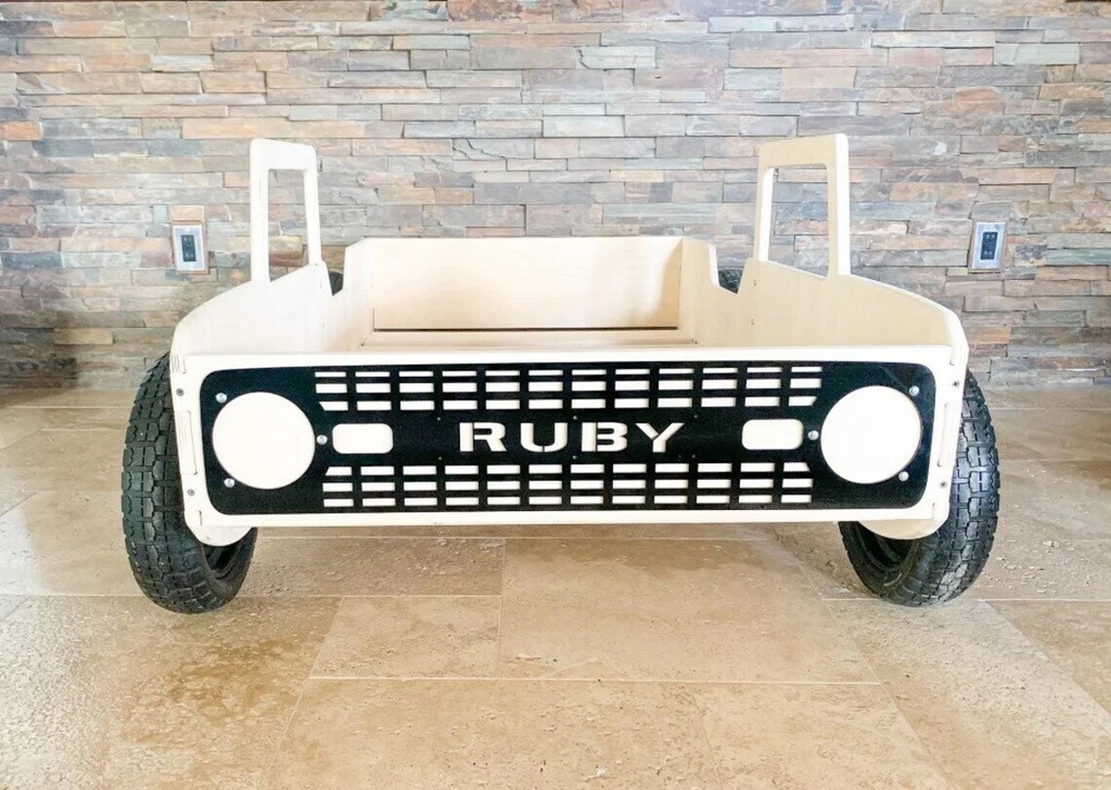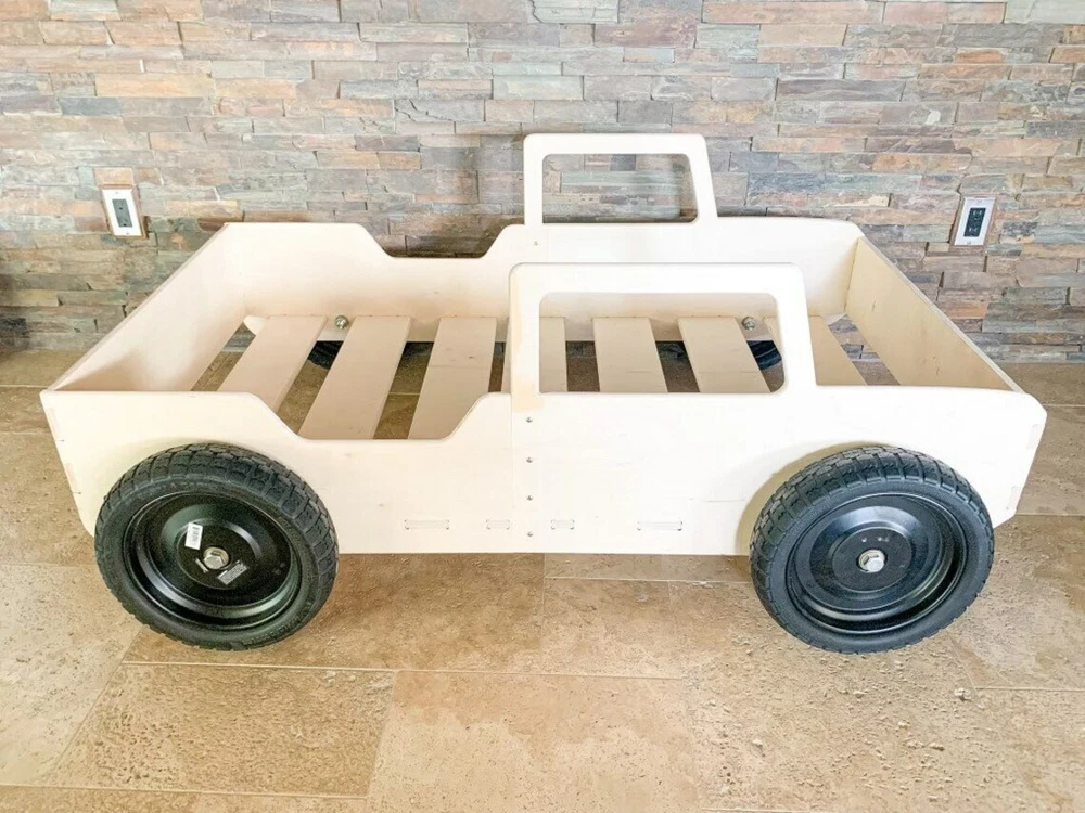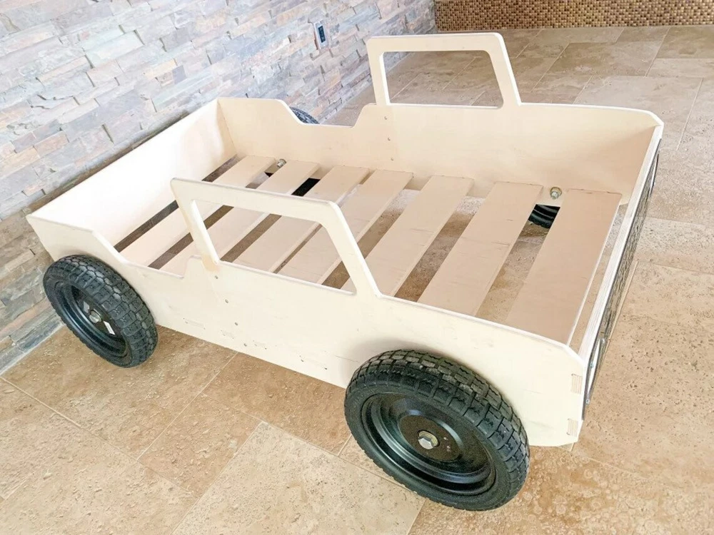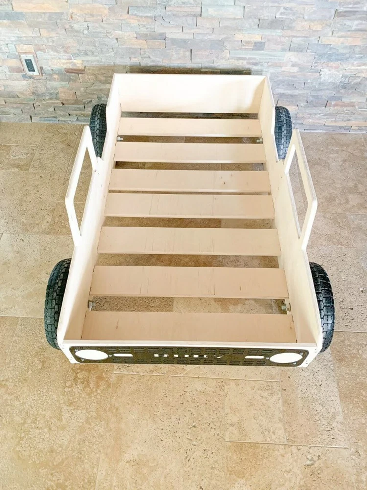 MONTESSORI TODDLER VEHICLE BED with ROLLING WHEELS MATTRESS NOT INCLUDED ★ Very Solid & Strong design | Made from 5/8" USA Baltic Birch plywood ★ This product comes pre-sanded. ★ The wood is untreated and beautiful left as-is, but can also be stained, painted or sealed should you chose to do so! ★ Bed is 53.5” long , 10" tall, and 32" wide. Fits most crib mattress’ including Ikea. ★ Assembly required - Very very easy to put together. All pieces slot together, hardware and detailed instructions included. ★ Tools Required: Philips Screwdriver and a Rubber Mallet (or a hammer wrapped in a t-shirt- Wood Joints can be tight depending on humidity levels) ★ Made to order with pride in the USA HOW DO I PERSONALIZE MY PRODUCT? Easy by clicking on the "Message to Seller" Section on Checkout and adding the customization information there. (10 Characters Max) GENERAL INFORMATION/DISCLAIMERS: -Wood is a natural material. Variations in color, knots, texture and grain may occur. -This product is made with Baltic Birch Plywood- a decorative hardwood plywood with a veneer core. -This product is both TSCA VI and CARB II compliant. -This product is manufactured in Las Vegas, NV. -This product comes pre-sanded. All products are wiped down prior to packaging, however, some wood dust may be present upon opening. -This wood product is untreated. It can easily be stained or painted once assembled. -Given that the wood is untreated, excessive exposure to the sun and/or water and other liquids may cause warping and/or staining over time. We suggest sealing your product if you plan to use it outdoors or around water/liquids.