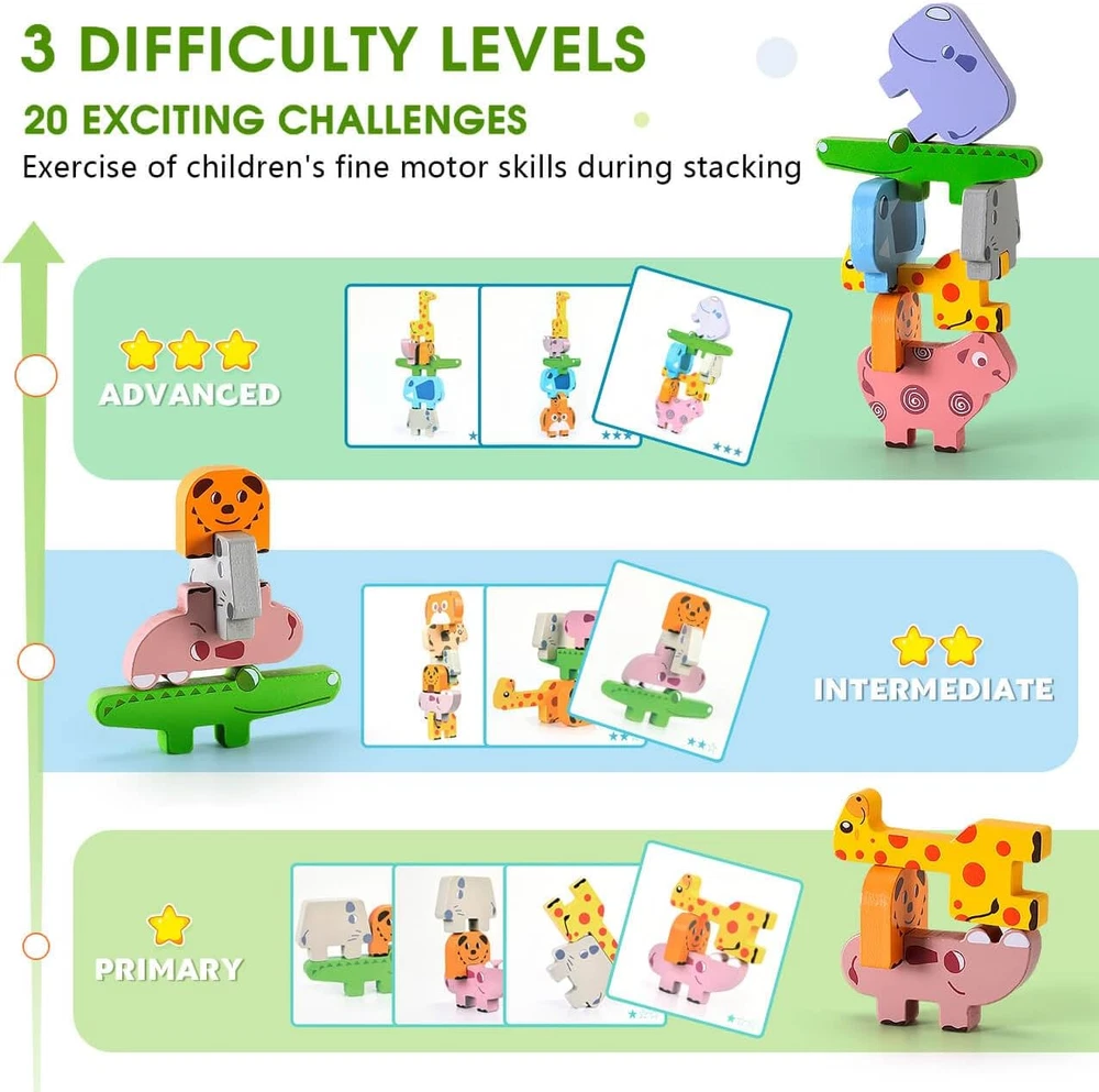 ANIMAL BLOCKS SET (10 Pieces) -- This stacking block set includes 10 chunky blocks, 10 double-sided challenge cards with three different levels of real challenge. WITTY AND CUTE -- This set of blocks presents a different kind of witty cuteness. There are 10 different shaped blocks with simple lines on the blocks to outline different animals: giraffe, sheep, puppy, cow, crocodile, hippo, elephant, mouse and rhino. START BRAIN GAMES -- Stack, pattern and multicolor shapes, but don’t be fooled by these endlessly enjoyable blocks mean fine motor skills and brain-boosting business. Whether it's a horizontal challenge or free stacking, it's all in the children's play! CHUNKY AND SAFE -- The chunky design makes it easier for young children to grasp. It is made of high quality wood and coated with an environmentally friendly water-based paint that is safe for your child. GIVE THE GIFT OF LEARNING -- Whether you’re shopping for holidays, birthdays, Uyogos , or just because. Bambilo toys is ideal gift for Halloween, Christmas, Easter or even for Homeschool. Product Description