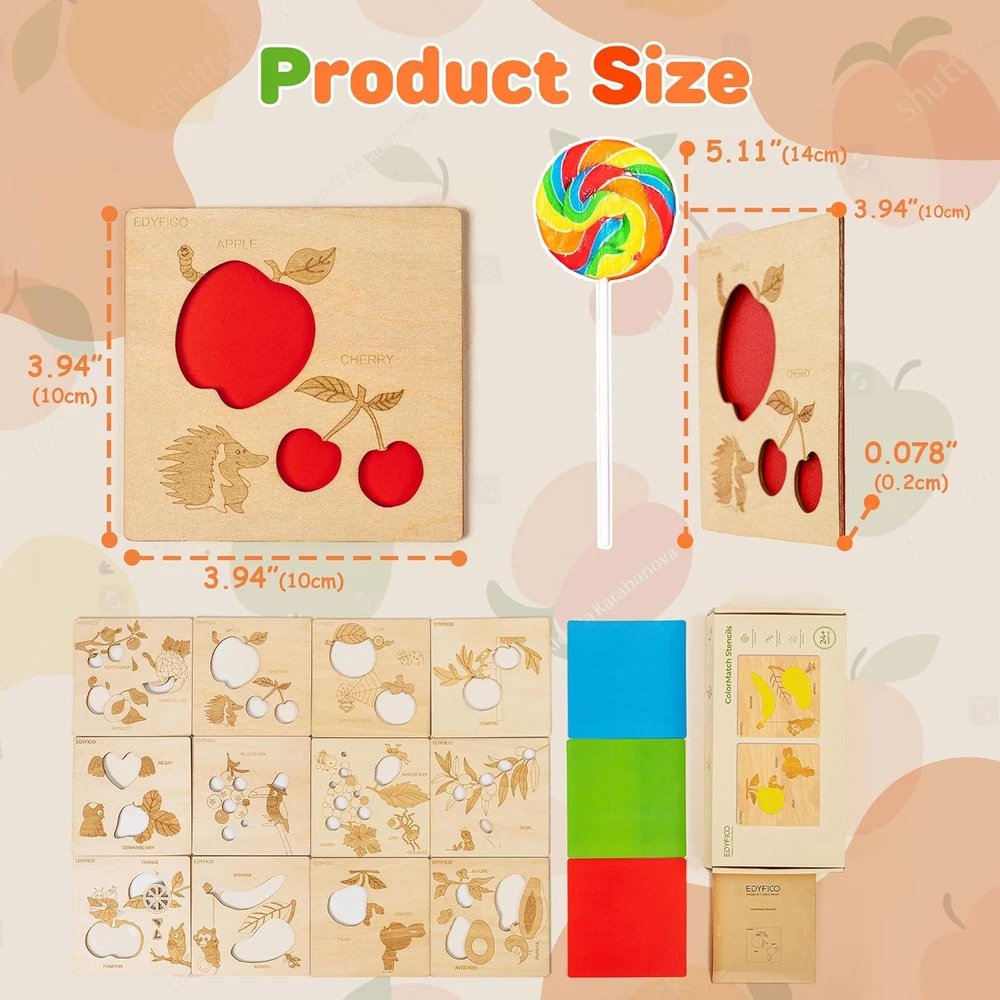 2-IN-1 EARLY CHILDHOOD MONTESSORI TOYS -These montessori toys for 2 year old include 12 smooth, polished wooden boards, each printed with 20 common fruit patterns and cute little animals, along with 3 colorful cardboard pieces. These colorful sensory toys will help children learn to recognize fruits and match colors during play! MULTIPLE DIY FUN -With the wooden shape color sorter, kids can engage in simple matching of fruit patterns and color cards. They can also utilize the unique hollow design of the wooden boards to explore the fun of light and shadow. Additionally, kids can use a paintbrush at home to trace the fruits and draw their favorites, or enjoy DIY painting to color the fruits with their favorite hues! TODDLER'S FRUIT PARADISE -The fruit-themed learning toys feature 20 common fruits found in daily life, such as apples, bananas, blueberries, oranges, strawberries, and mangoes. The open ended toys can fully capture children's attention, and parents can interact with their children to find colors in everyday life, promoting the relationship and communication between parents and children FUNNY OUTDOOR TOYS -Designed for playing and learning color recognition, shapes, classification, and analysis both indoors and outdoors, whether at home or on the go. This set of travel toys is suitable for children aged 1 to 3 years old. The set is small and lightweight, making it easy to carry and store, so children can enjoy it anywhere—perfect for home, school, parks, or travel BUY WITH CONFIDENCE -Made with non-toxic, high-quality materials, featuring rounded corners and a smooth, burr-free finish. Our STEM toys offer exceptional quality for your toddler's early education! Matching instructions and game ideas are always available via the QR code in the instruction booklet Product Description