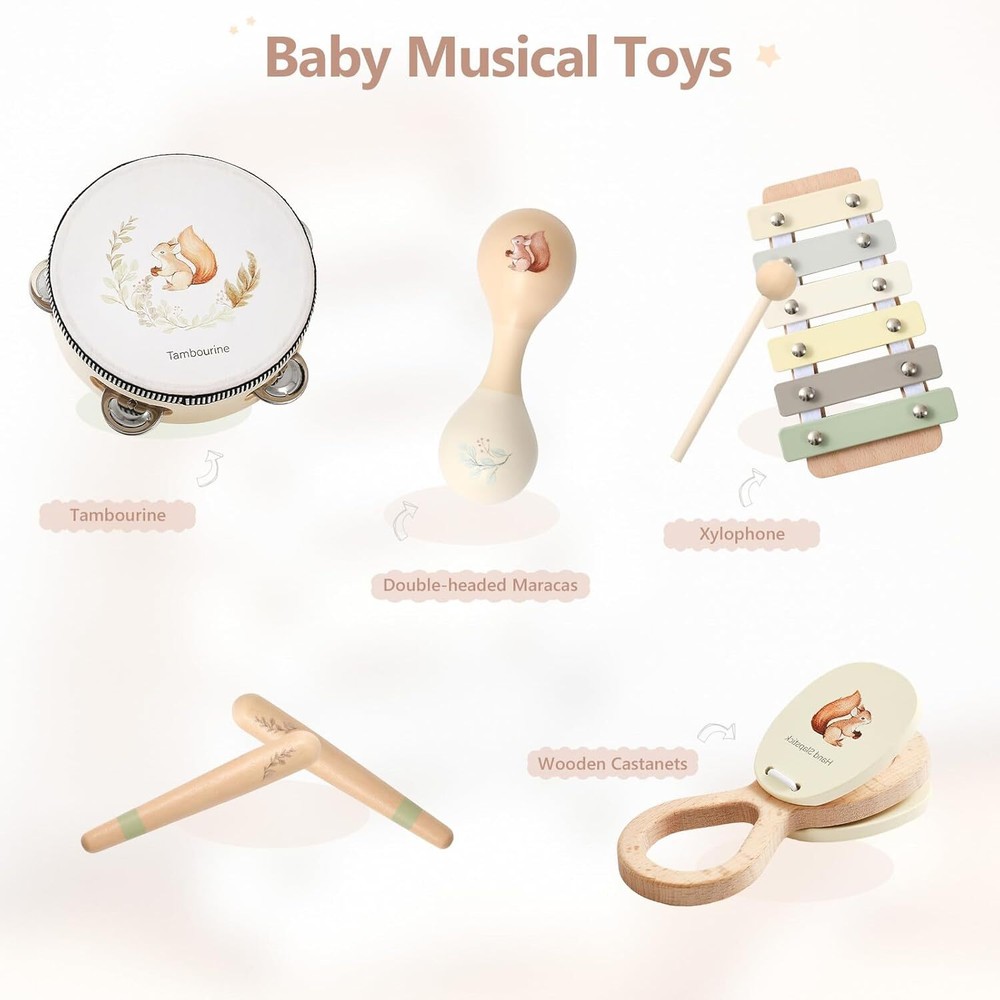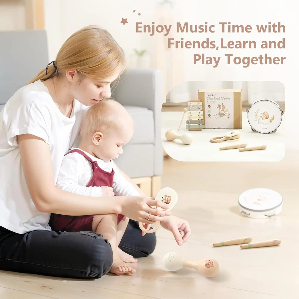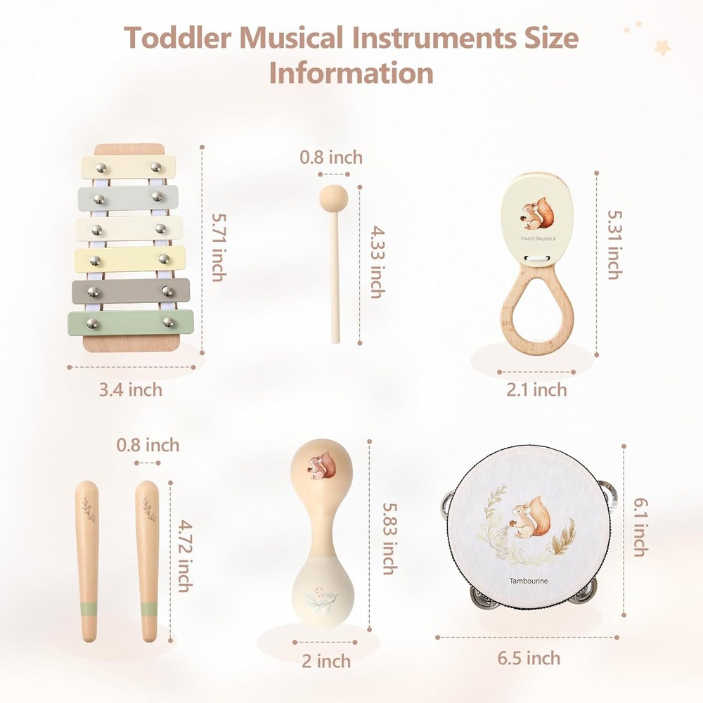 1. This adorable wooden musical set is a hit with my little one! The bright xylophone, fun tambourine, and rattle-like sand hammer keep her engaged while developing rhythm and coordination. The pieces are perfectly sized for tiny hands, made from smooth, safe wood, and produce lovely soundsβ€”no annoying plastic noise! She loves shaking, tapping, and discovering different tones, and I love the Montessori-inspired learning. Great quality, endless entertainment, and a wonderful way to introduce music early. Highly recommend!