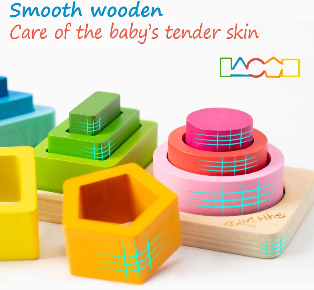 Wood Montessori Sorting and Stacking Toy - This sorting toy is ideal for children. It comes with 20 pieces in 5 different colors and five different geometric shapes and is made of high quality, 100% safe wood with sturdy pegs and long-lasting water-based paint. It is an ideal toy for boys and girls aged one to three to play and learn Baby's Intellectual Enlightenment - Intellectual development features and a distinctive style shape can assist children in improving their hand-on, counting, and sorting abilities.Colors that are unfamiliar to children can help them improve their color recognition skills. The toy's pegs and shapes are large enough to fit babies' tiny hands, making it ideal for wrist coordination training The Most Effective Learning Ethod - This stacking toy is a simple puzzle game. Children can use it to learn how to put together and stack various shapes such.Place one piece on top of another based on the number of pegs and move little hands to see where the shape fits. Children coordinate their body movements with stacking and sorting activities Baby Design with Thought - Your child will adore artisans' well-crafted and brightly colored creations. It is made of natural wood. The entire panel's smooth edges and nails will not scratch your baby's skin. This product has passed the ASTM, CPSIA, and CPC certifications,Material: Wood,Size: 11.4 x 2.36 x 2.16 inches The Ideal Present for a Unique Child - As a parent, you naturally expect only the best for your kid. You'll appreciate our Montessori preschool stacking toy. It is an excellent Christmas, birthday, New Year's, and educational gift for children. Remember to photograph your children's surprised and delighted expressions when they receive gifts Product Description Wooden montessori toys for toddlers age 1+ Symdiro is a comprehensive wooden toy company,We specialize in producing all kinds of wooden toys. These toys have educational significance and increase children's learning fun. We believe that because of work, adults spend less and less time with their children. Games and toys are essential for the growth of our children. Our toys provide educational fun for children and a great experience for everyone. Our wooden sorting & stacking toys can lead children to explore the original world, let them learn to cognitive colors, shapes and numbers while happy play. It will improve baby‘s sensory ability, attention, logical thinking ability, hand-eye coordination, motor skill, develop their imagination and creativity. Specifically design for 12 months+ preschool children Food-grade safety materials - Wooden stem toy is made of natural wood, three-layer safe paint is covered on the surface, and the bright color paint will never fall out. Perfect size for child - Each shapes size are exactly suitable for toddler's hands. Careful polishing workmanship - Each corner of the shape blocks, pegs and wooden boards were carefully polished, smooth and round surface can protect the child's tender skin well.