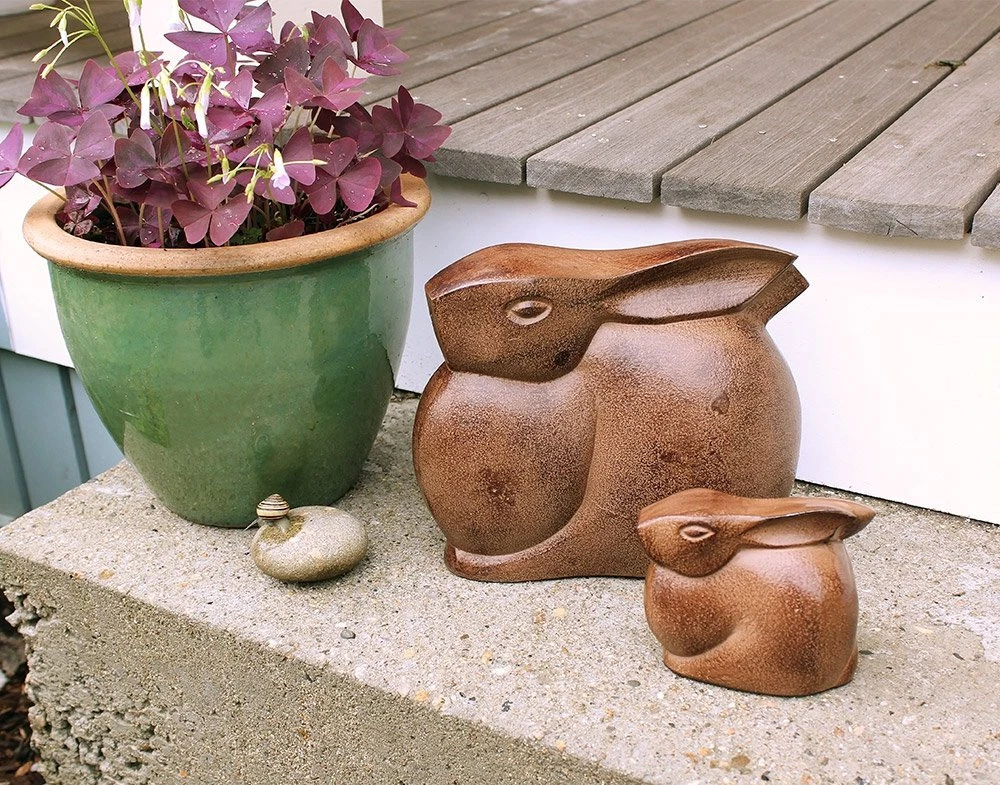 In many cultures, the markings on the surface of the moon were seen to form the outline of a rabbit, giving rise to many stories about this Moon Rabbit, most prominent in Chinese folklore and Aztec mythology. Our Moon Bunnies are stylized rabbits for the garden, in sizes, nestling down in the foliage. Charming Garden Accent- Our Moon Bunny yard ornaments are a sweet addition to any garden. Add an air of tranquility with Moon Bunny or a pair, nestled beneath your flowers and plants. These graceful rabbit garden statues will nicely complement any other animal statues or lawn decorations you have. Beautify your yard with a bunny! Decorate Any Space- Indoor or outdoor, use these decorative bronze rabbits as fun figurines or unique art sculptures in the home or garden. They can add to both modern and vintage décor. You could even add these bunnies to a nursery or Easter display. Cast Aluminum with Antique Bronze Finish: These bunny garden accents are specially crafted out of cast aluminum with antique bronze finish that will not rust. These statues are made to withstand most weather conditions, unlike breakable ceramic or glass, giving you extended years of use. Their earthy color makes them stand out in your garden without taking away from the surrounding natural beauty of your plantings. In Sizes: Choose the size appropriate for your garden or make a parent-baby pair. This Large Moon Bunny statue measures 3. 8 inches wide, 9. 25 inches long, and 7 inches tall, the small is 4 1/8-in L x 3 ¾-in H. Easy to put away when summer ends. At , we have created a full line of unique and handmade garden accessories and home furnishings for the plant enthusiast. We continue to add to our exquisite indoor-outdoor product line each year, resulting in a large selection of items for your home, yard, porch, patio, or garden decor.