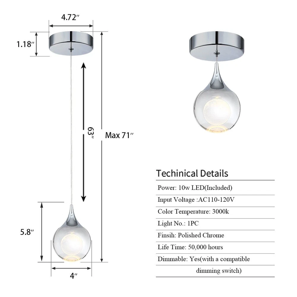 Premium LED Pendant Light with ETL Certification, using high-quality iron, aluminium, and crystal materials and advanced laser-engraved pattern and surface plating treatment for a high-quality chrome finish, this crystal pendant light has good light transmittance, refraction effect, hardness, and texture. With a 3D moon inside the crystal, it's beautiful when the light is on; you will see the shining moon, which can bring an elegant and unique decoration to any room. Just like a waterdrop or teardrop, creating an elegant atmosphere in your room can be installed in the living room, dining room, bedroom, kitchen island, study room, foyer, etc. It'll be better for you to decorate your home with 1 or 2 or 3 of these pendant lights.Four colors: please note that the light is tinny; please Free Shipping Over $49.99* Details Moon Crystal 1-light Single Globe LED Hanging Pendant Light in Gold/ Product Description: Premium LED Pendant Light with ETL Certification , using high-quality iron, aluminium, and crystal materials and advanced laser-engraved pattern and surface plating treatment for a high-quality chrome finish, this crystal pendant light has good light transmittance, refraction effect, hardness, and texture. With a 3D moon inside the crystal, it's beautiful when the light is on; you will see the shining moon, which can bring an elegant and unique decoration to any room. Just like a waterdrop or teardrop, creating an elegant atmosphere in your room can be installed in the living room, dining room, bedroom, kitchen island, study room, foyer, etc. It'll be better for you to decorate your home with 1 or 2 or 3 of these pendant lights. Four colors please note that the light is tinny; please check the size before purchase Gold (dimmable brightness) Chrome (dimmable brightness) Black (dimmable brightness & 3 color temperature) Coffee (dimmable brightness & 3 color temperature) Features: **Customizable Length** The 4.72" canopy and 63" cord offer flexibility to adjust the length to suit your lighting needs, making it suitable for various locations and preferences. **Sophisticated Craftsmanship** Crafted from high-quality K9 crystal, this pendant light boasts a solid, heavy crystal ball that reflects light beautifully **Eye-Friendly Feature** The crystal is not only aesthetically pleasing but also gentle on the eyes, ensuring long-lasting use. **Efficient & Long-Lasting** ETL-certified, this pendant light can provide 50,000 hours of illumination with just 5W of energy, emitting 400 lumens of brightness. **Adaptable Design** Perfect for creating ambient or mood lighting, this small, modern pendant light is ideal for decorating the kitchen, above the island, sink, or counter, as well as in the bedroom and bathroom. Specifications: Fixture DesignSingle Fixture ShapeGlobe CanopyYes Number of Lights1 Adjustable Hanging LengthYes Number of Light Tiers1 Light DirectionMultiple Directions Shade IncludedYes Shade MaterialCrystal Shade ColorWhite Fixture MaterialMetal Metal TypeAluminum Crystal ComponentYes Real CrystalYes Crystal Colorclear Crystal TypeEgyptian Dry, Damp or Wet Location ListedDry Integrated LEDYes Integrated LED Wattage5 Watt Integrated LED Brightness (Lumens)500 lm Integrated LED Color Temperature3000K Integrated LED Rated Lifespan50000 hours Integrated LED Color Rendering Index (CRI)90 DimmableYes Voltage120 Volt Maximum Wattage (Per Bulb)10 Watt Power SourceHardwired Product CareWipe clean with a dry cloth Supplier Intended and Approved UseResidential Use; Non-Residential Use Hanging MethodWire Craftsmanship TypeHand Carved Cable / WiringClear / Standard Plastic Cord UL ListedYes