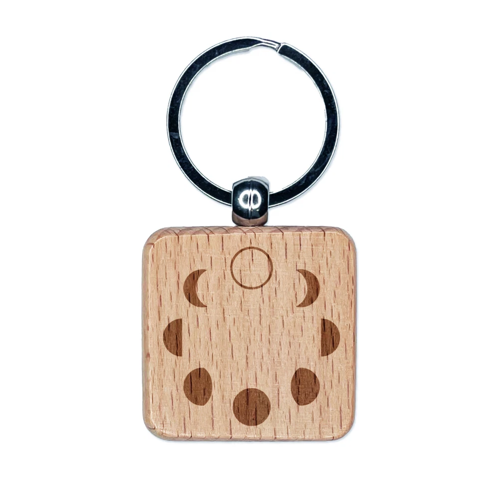 Moon Phases Circle Engraved Wood Square Keychain Tag Charm