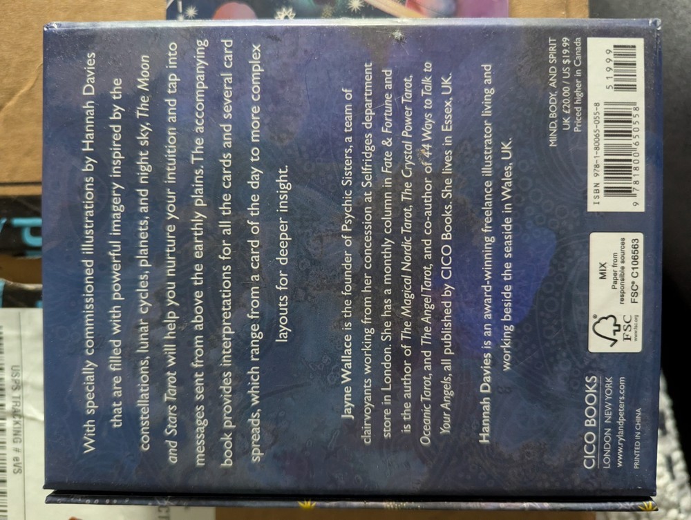 I've only used this deck once. If you've ever had tarot cards before, you know how it goes-- sometimes you just don't "vibe" with certain decks. However, this will be a great deck for someone else., and I know it will find the home it's meant to go to. Because it was only used once and has been in storage, the cards and guidebook are in brand new condition. The box looks almost perfect on the outside as well and has a magnetic close. The only reason I categorized this that as "very good" instead of "like new" Is due to some wear and tear on the inside of the box (see pictures). Other than that, this set looks like it just came from the store. The Moon and Stars Tarot, published by Ryland Peters & Small in 2021, is a beautifully crafted divination tool that includes a full deck of 78 specially commissioned tarot cards and a 64-page illustrated book. Authored by Jayne Wallace, this set is designed for those interested in body, mind & spirit genres, specifically in divination, fortune telling, and astrology. The compact size of 6 x 1.7 x 4.5 inches makes it convenient for on-the-go use, and the English language text makes it accessible to a wide audience. This set is a valuable addition to any tarot enthusiast's collection.