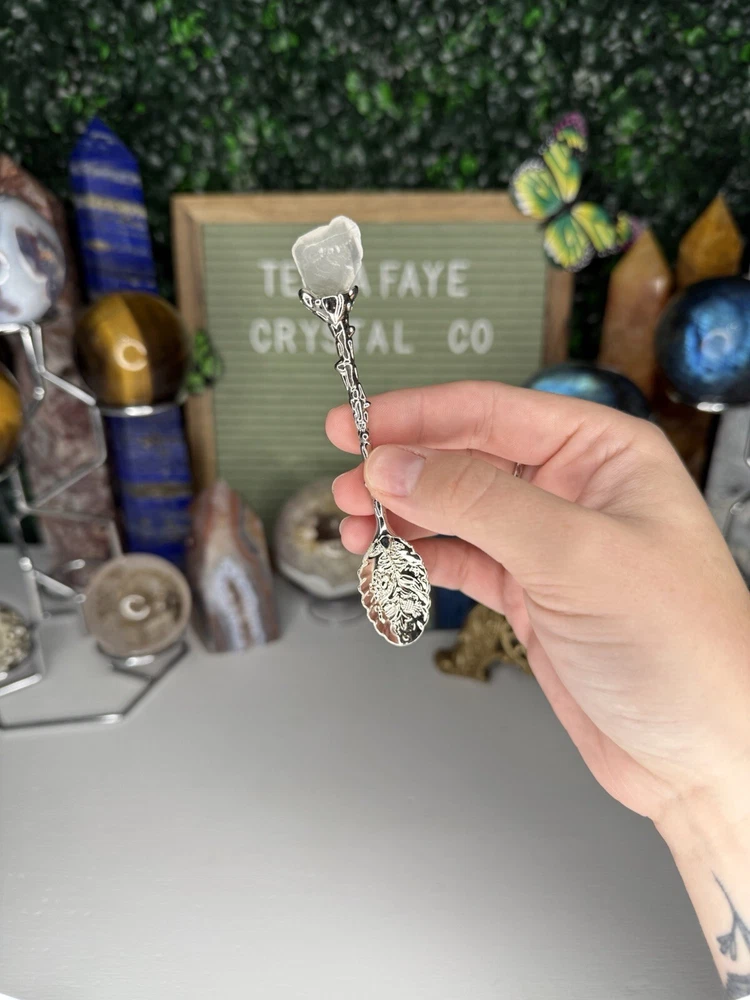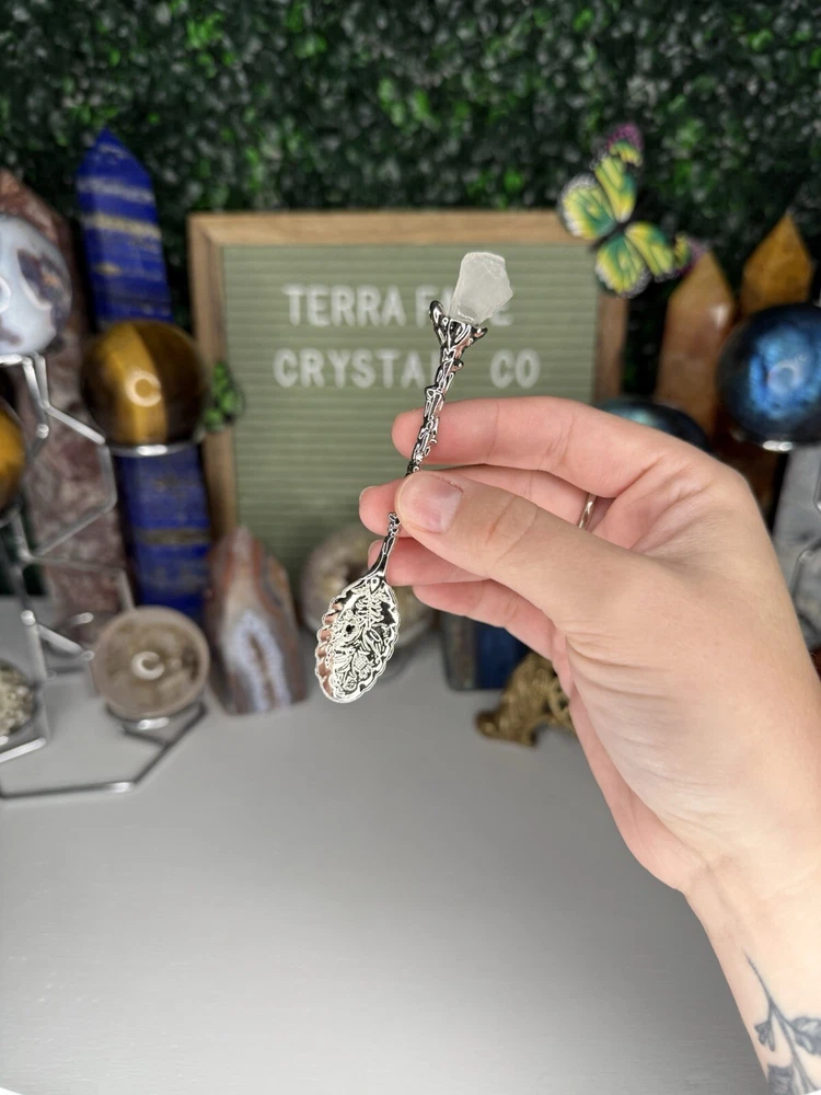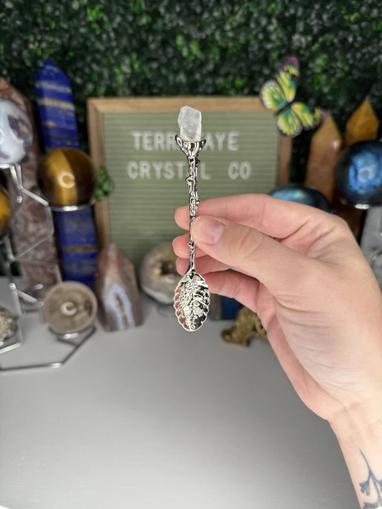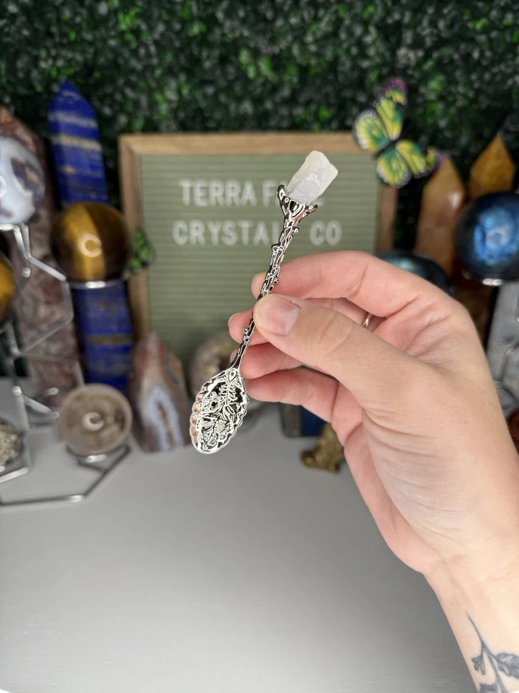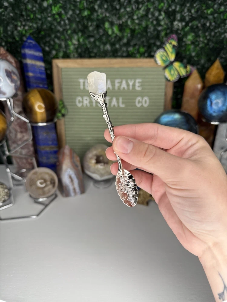 Listing is for one (1) Moonstone Crystal Spoon. Your spoon will then be hand selected for you. Spoons are made of zinc alloy die-cast electroplating. Do not use in microwave or dishwasher. Hand wash after using.