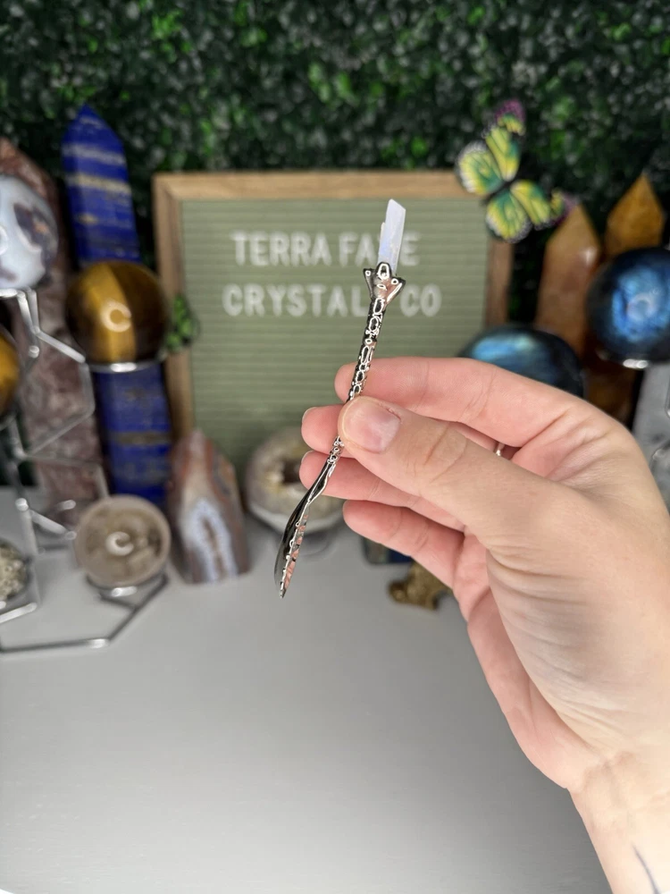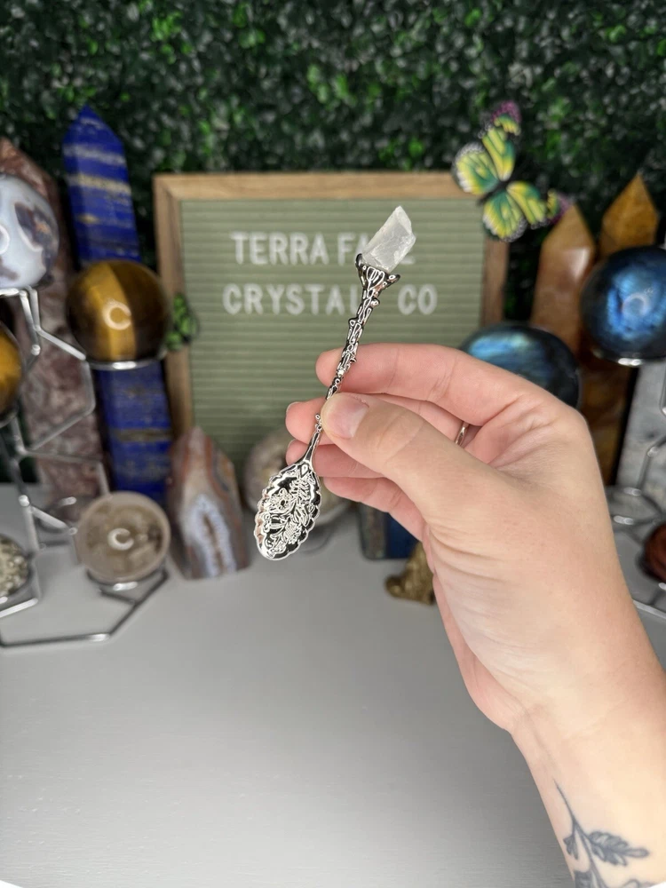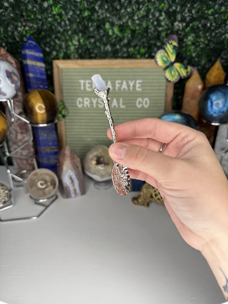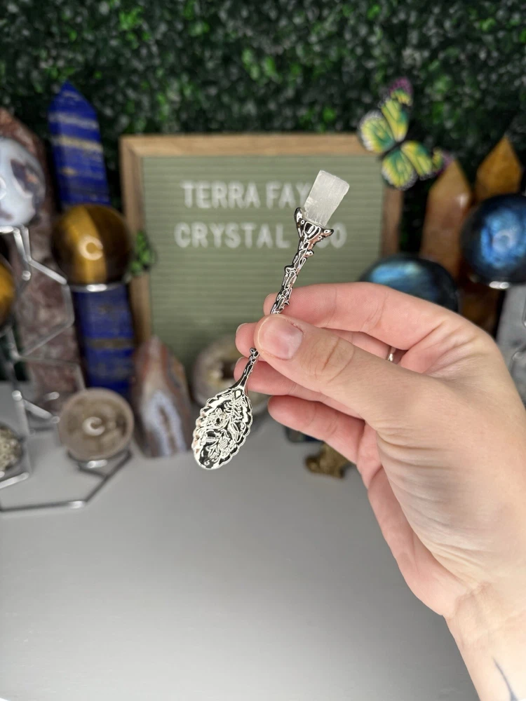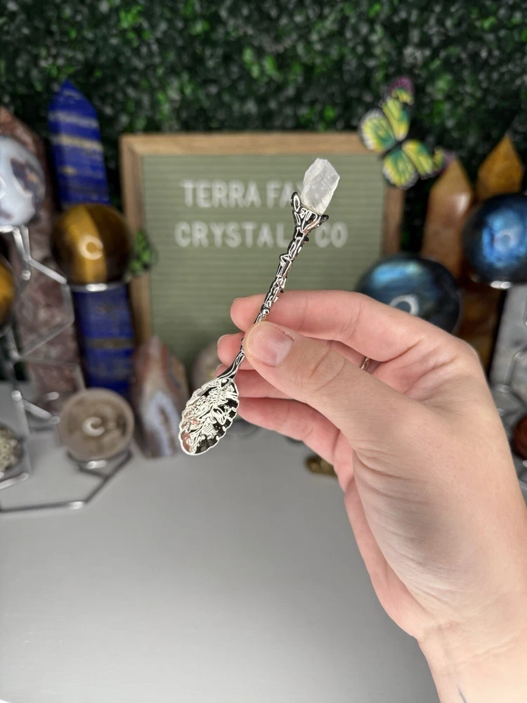 Listing is for one (1) Moonstone Crystal Spoon. Your spoon will then be hand selected for you. Spoons are made of zinc alloy die-cast electroplating. Do not use in microwave or dishwasher. Hand wash after using.