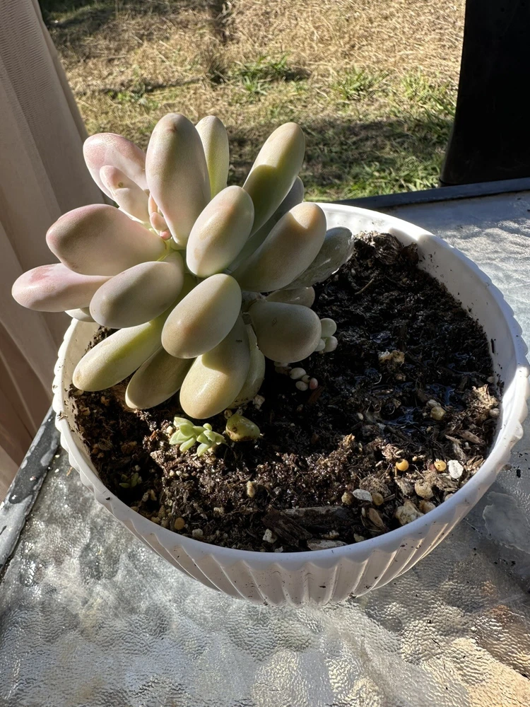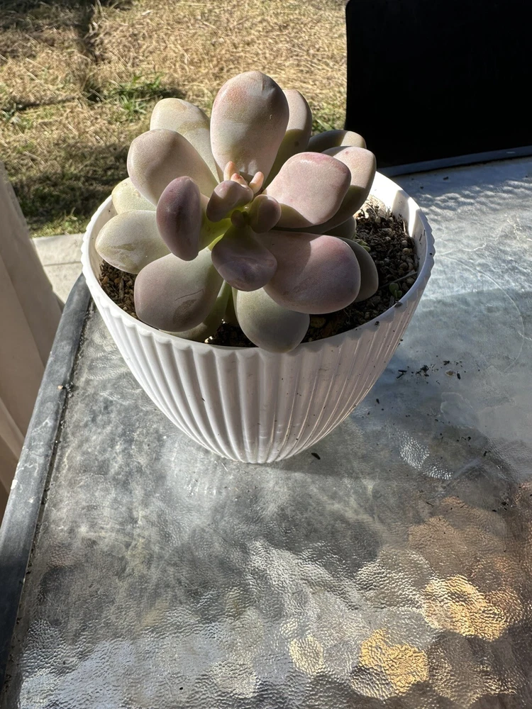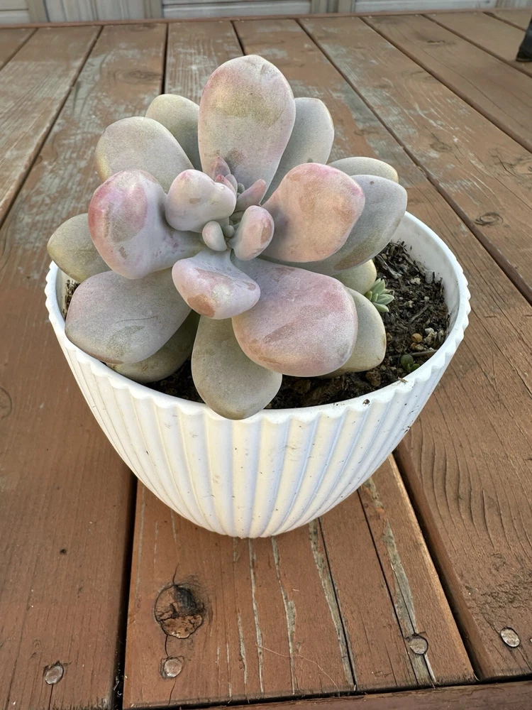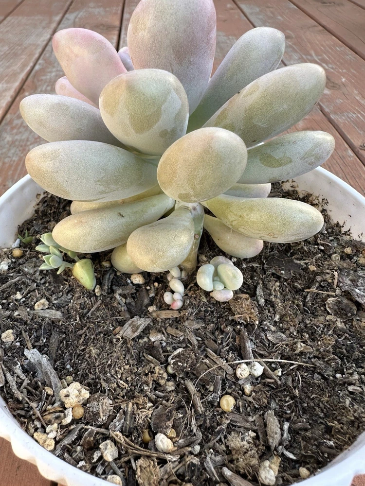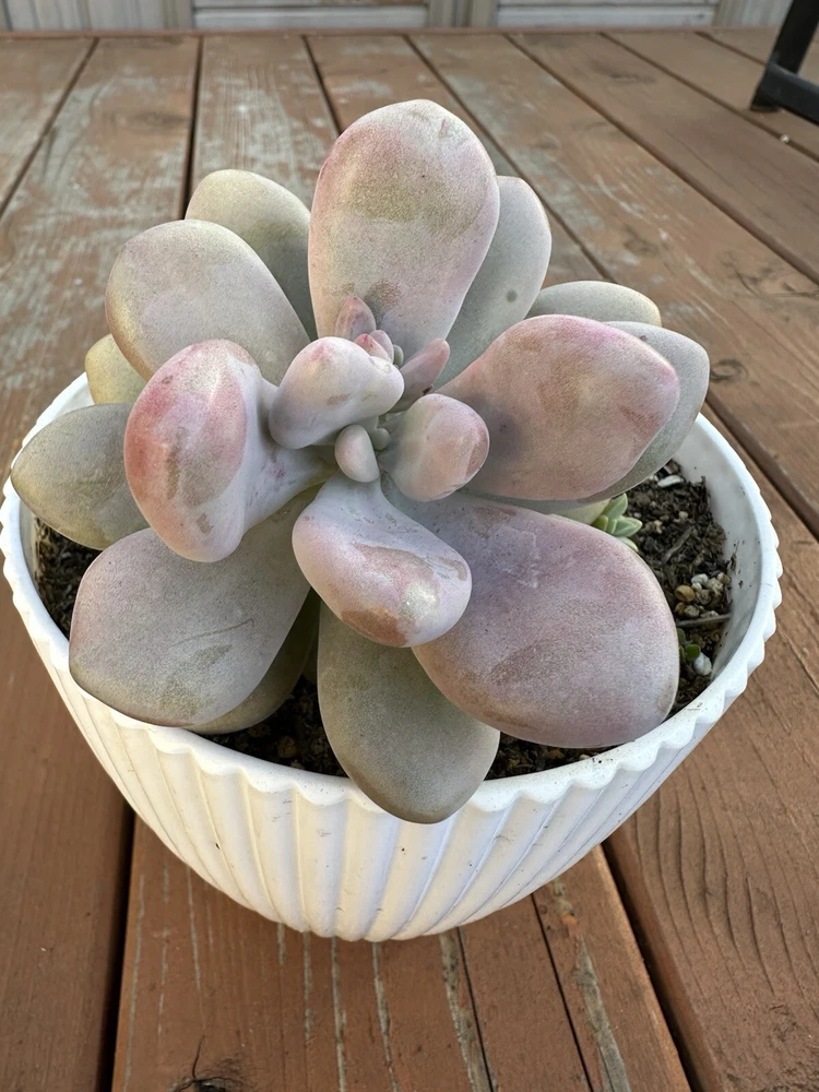 A Moonstone Succulent in a 10" pot, fully rooted with new growth. This Echeveria plant features multicolor leaves and is suitable for both indoor and outdoor settings. It thrives in full sun and is pet-safe. Perfect for cacti and succulent lovers looking to add a vibrant addition to their home or garden.