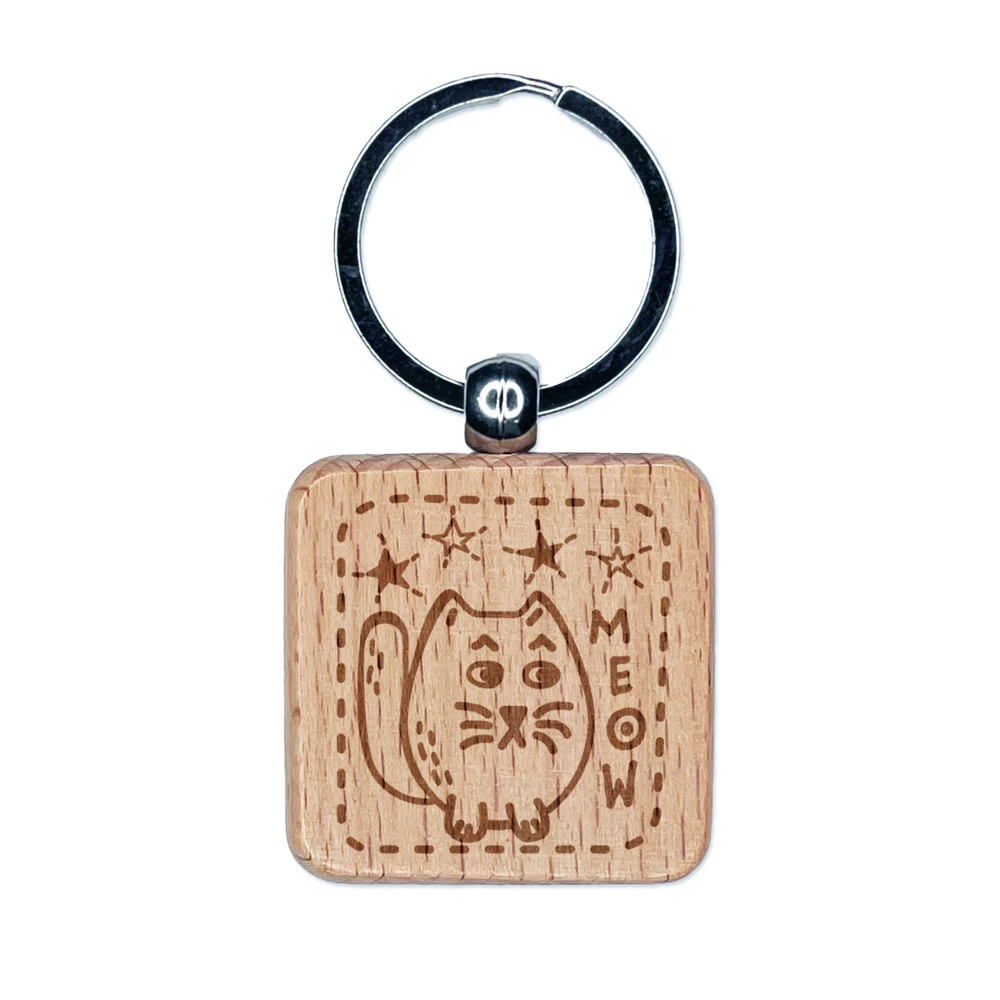 Mopey Cat Meow and Stars Engraved Wood Square Keychain Tag Charm