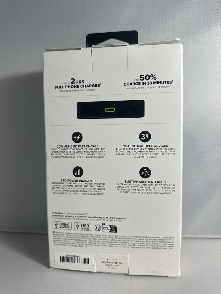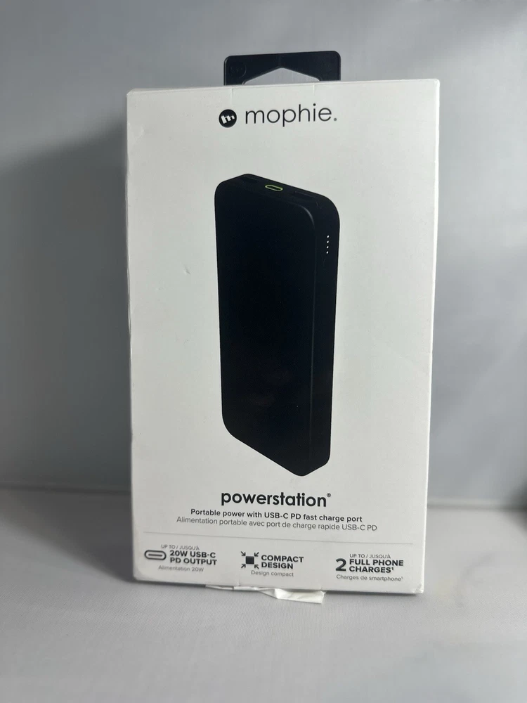 Introducing the Mophie Powerstation 10000mAh 20W USB-C PD 2x USB-A charger, a sleek and stylish addition to your mobile device accessories. With a capacity of 10000mAh, this charger is perfect for on-the-go charging needs. Its USB-C connectivity allows for fast charging of your device, while the 2x USB-A ports provide additional charging options. This charger is compatible with a variety of devices and comes in a striking black color. Its location is E8, making it a perfect addition to your collection of cell phone accessories. Get your hands on the Mophie Powerstation charger and enjoy reliable, high-speed charging wherever you go.