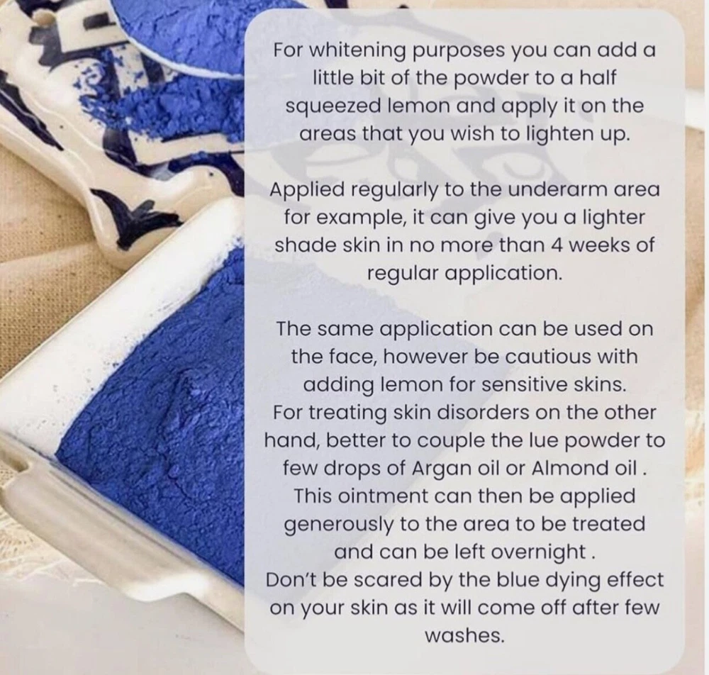 Moroccan Blue Nila Natural Whitening for Skin& Face | 50g | نيلة مغربية زرقاء النيلة الزرقاء المغربية ~ مسحوق تفتيح طبيعي للبشرة والوجه Product Name: Moroccan Blue Nila ~ Natural Whitening Powder for Skin & Face Package Quantity: Available in various sizes (Choose your preferred quantity) Description: Moroccan Blue Nila is a 100% organic whitening powder derived from natural plant extracts and minerals. This traditional beauty secret has been used for centuries by Moroccan women to brighten and even out skin tone. It's an effective remedy for reducing dark spots, hyperpigmentation, and other skin discolorations, leaving your skin looking radiant, smooth, and glowing. Ingredients: Blue Nila plant extract Natural minerals Organic ingredients, free of chemicals Benefits: Lightens and brightens skin naturally Reduces dark spots and hyperpigmentation Soothes and smoothens the skin Perfect for all skin types, including sensitive skin 100% organic and free of harmful chemicals How to Use: Mix a small amount of Blue Nila powder with rose water or your favorite hydrating toner. Apply to your face or skin areas you want to lighten. Leave it on for 10-15 minutes, then wash off with lukewarm water. Use 2-3 times a week for best results. Versatile Uses: Face mask to brighten and even skin tone Spot treatment for dark areas Can be used on the body for a full skin glow Origin: Handcrafted in Morocco, Blue Nila has been used as a natural remedy for centuries by Moroccan women. Customer Feedback: Many customers have experienced noticeable skin improvements with consistent use of Blue Nila powder. Try it and share your results with us! Moroccan Blue Nila, Natural Whitening Powder, Organic Skin Brightener, Hyperpigmentation Remedy, Dark Spot Treatment, Face Whitening, Moroccan Beauty Secret, Natural Skin Care, Blue Nila Powder النيلة الزرقاء المغربية ~ مسحوق تفتيح طبيعي للبشرة والوجه - 100 ٪ عضوي وصف القائمة : اسم المنتج : النيلة الزرقاء المغربية ~ مسحوق تفتيح طبيعي للبشرة والوجه الكمية : متوفر بأحجام مختلفة ( اختر الكمية التي تفضلها ) الوصف : النيلة الزرقاء المغربية هي مسحوق تفتيح عضوي 100 ٪ مشتق من مستخلصات النباتات والمعادن الطبيعية . استخدمت النساء المغربيات هذا السر الجمالي التقليدي لقرون لتفتيح وتوحيد لون البشرة . إنه علاج فعال لتقليل البقع الداكنة، فرط التصبغ وتغيرات اللون الأخرى، مما يترك بشرتك مشرقة وناعمة ومتألقة . المكونات : مستخلص نبات النيلة الزرقاء معادن طبيعية مكونات عضوية وخالية من المواد الكيميائية الفوائد : يفتح ويفيض البشرة بشكل طبيعي يقلل من البقع الداكنة وفرط التصبغ يهدئ وينعم البشرة مثالي لجميع أنواع البشرة بما في ذلك البشرة الحساسة عضوي 100 ٪ وخالي من المواد الكيميائية الضارة كيفية الاستخدام : امزجي كمية صغيرة من مسحوق النيلة الزرقاء مع ماء الورد أو التونر المفضل لديك . ضعيه على وجهك أو المناطق التي ترغبين في تفتيحها . اتركيه لمدة 10-15 دقيقة ثم اغسليه بالماء الفاتر . استخدميه 2-3 مرات في الأسبوع للحصول على أفضل النتائج . الاستخدامات المتعددة : قناع للوجه لتفتيح وتوحيد لون البشرة علاج للبقع الداكنة يمكن استخدامه على الجسم للحصول على توهج كامل للبشرة الأصل : تم تصنيعه يدويًا في المغرب، واستخدمت النساء المغربيات النيلة الزرقاء كعلاج طبيعي لعدة قرون . ملاحظات العملاء : لقد لاحظ العديد من العملاء تحسينات واضحة في بشرتهم بعد الاستخدام المنتظم لمسحوق النيلة الزرقاء . جربيه وشاركي نتائجك معنا ! كلمات البحث : النيلة الزرقاء المغربية، مسحوق تفتيح طبيعي، مبيض للبشرة العضوية، علاج فرط التصبغ، علاج البقع الداكنة، تفتيح الوجه، سر الجمال المغربي، العناية بالبشرة الطبيعية، مسحوق النيلة الزرقاء Nila Bleue Marocaine ~ Poudre Blanchissante Naturelle pour la Peau & le Visage - 100% Bio Nom du produit: Nila Bleue Marocaine ~ Poudre Blanchissante Naturelle pour la Peau & le Visage Quantité de l'emballage: Disponible en différentes tailles (Choisissez la quantité souhaitée) Description: La Nila Bleue Marocaine est une poudre blanchissante 100% biologique, issue d'extraits de plantes et de minéraux naturels. Ce secret de beauté traditionnel est utilisé depuis des siècles par les femmes marocaines pour éclaircir et uniformiser le teint. Elle est efficace pour réduire les taches sombres, l'hyperpigmentation et d'autres décolorations de la peau, laissant votre peau radieuse, douce et éclatante. Ingrédients: Extrait de plante Nila Bleue Minéraux naturels Ingrédients bio, sans produits chimiques Avantages: Éclaircit et illumine la peau naturellement Réduit les taches sombres et l'hyperpigmentation Apaise et adoucit la peau Parfait pour tous types de peau, y compris les peaux sensibles 100% biologique et sans produits chimiques nocifs Comment utiliser: Mélangez une petite quantité de poudre de Nila Bleue avec de l'eau de rose ou votre toner hydratant préféré. Appl