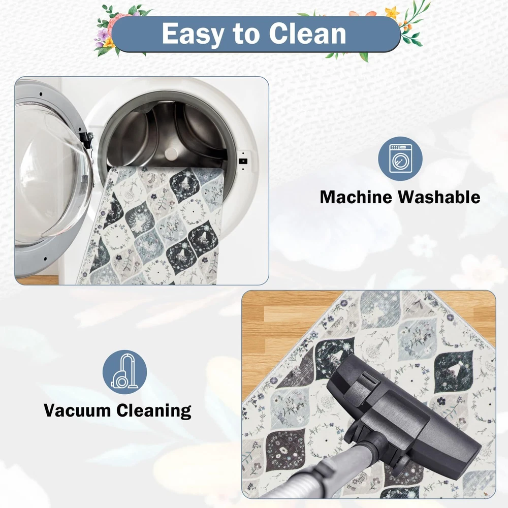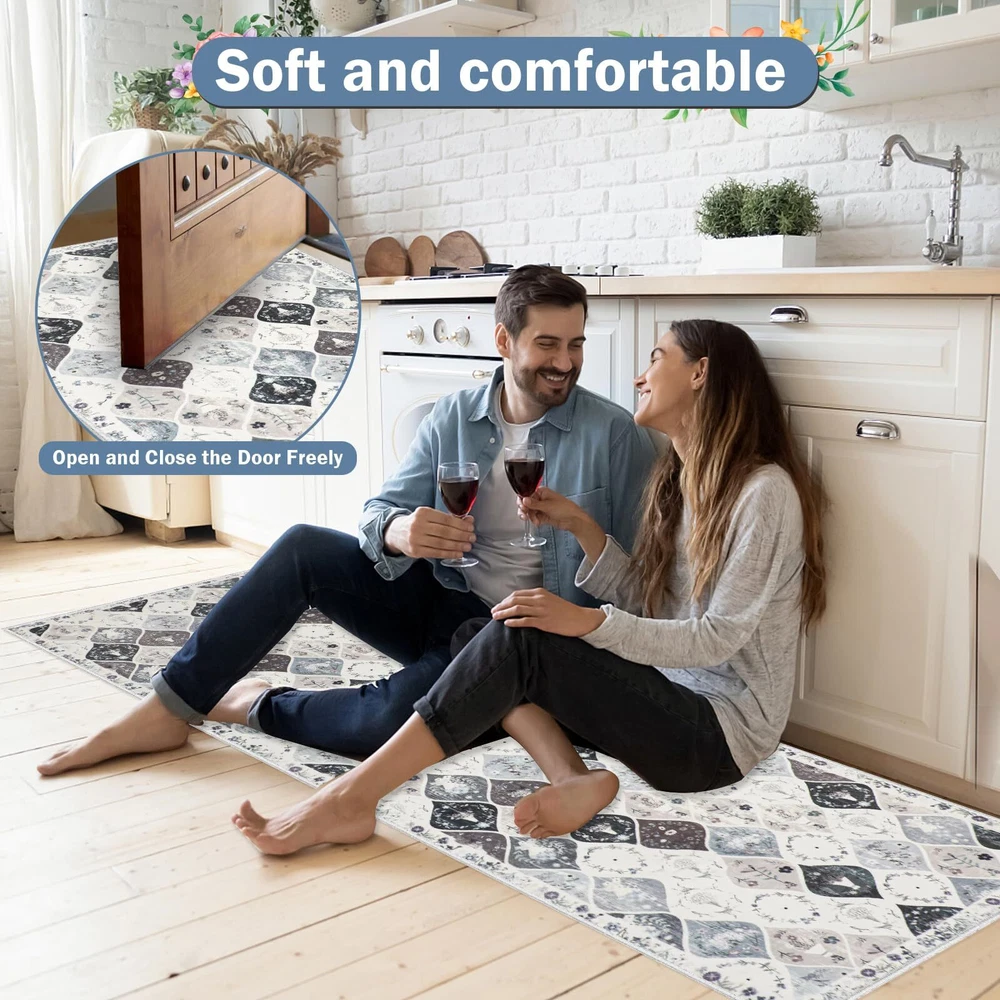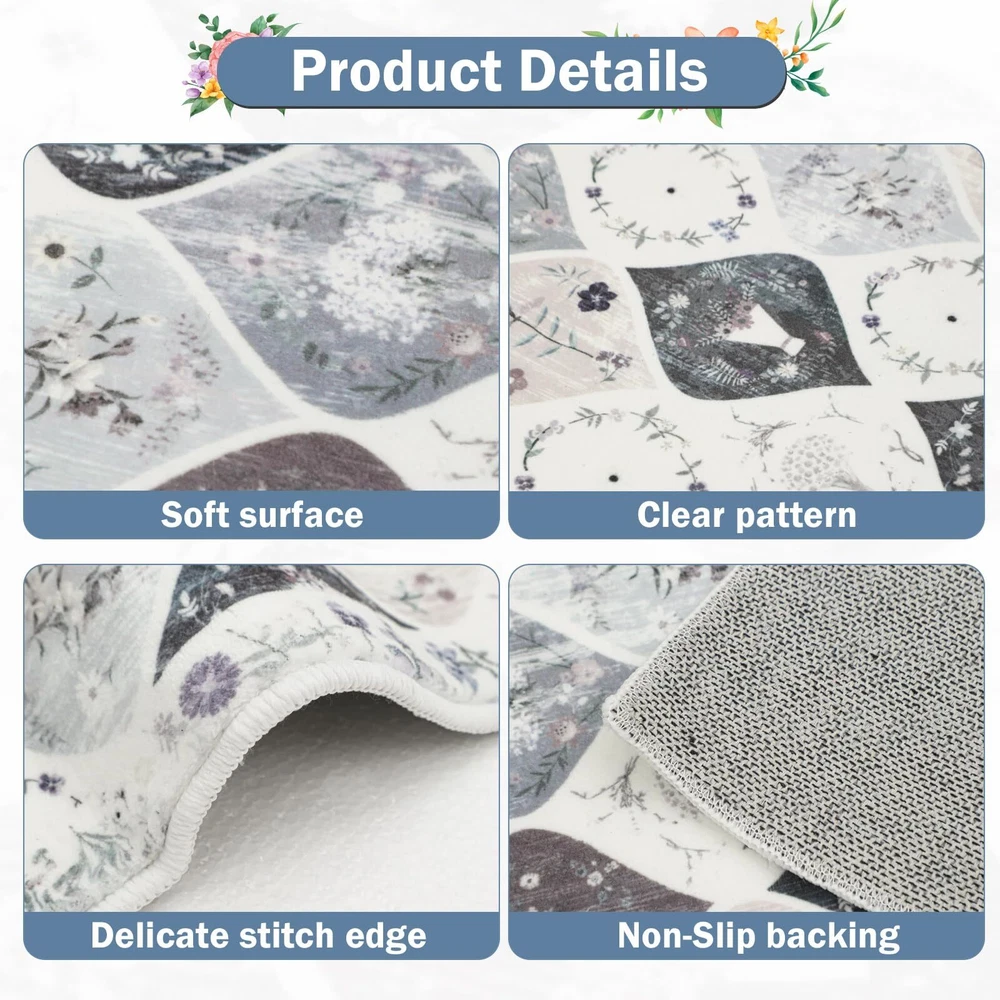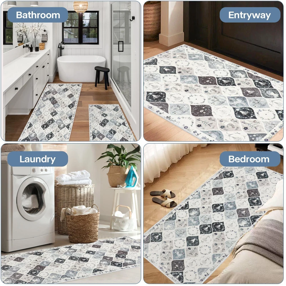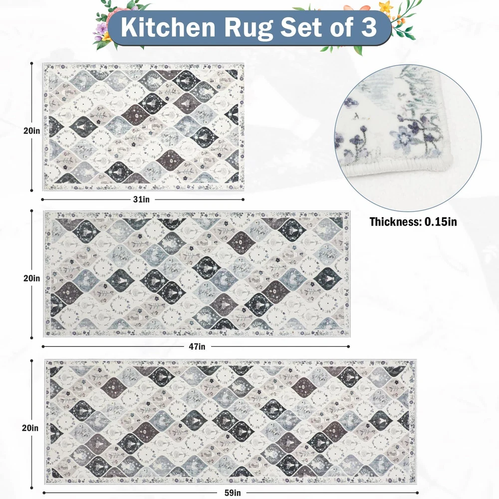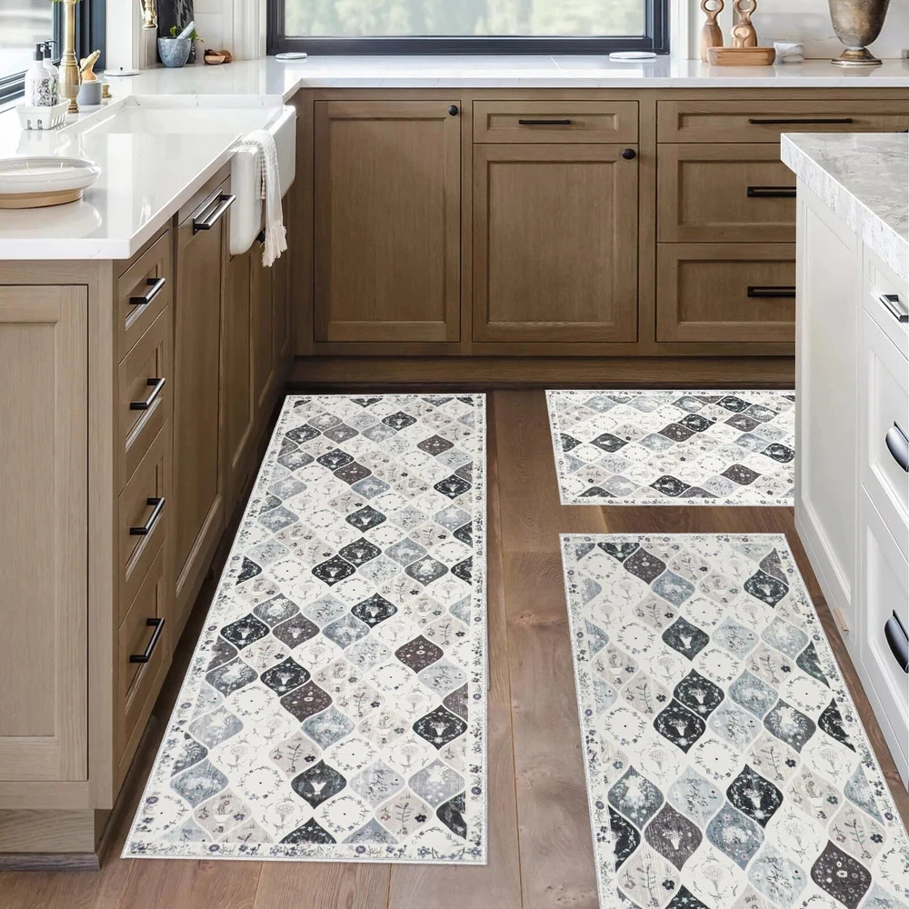 Kitchen Rugs Sets 3 Piece with Runner: This vintage moroccan trellis kitchen rugs set includs 3 pieces,the size is 20"x32"+20"x47"+20"x59", Which is perfect for your kitchen, laundry room decor. This no slip kitchen mat rug set with runner will be very comfortable to stand on when you are cooking or baking or working. Non-slip Washable Kitchen Rugs Set: The floral kitchen floor mat set made of premium washed cashmere fabric material, TPR and Cotton Non-skid Backing, Which is very non slip and durable. Eye-catching design: This washable kitchen rug runner has a trendy fade style and floral pattern, the vintage elegant tones blend perfectly with different home designs, and the material of the surface is so soft and delicate, your feet will be very comfortable on it. Easy to clean and storage: This washable kitchen rug runner is very easy to clean, you can use hand-held vacumm to clean the dirt, for deeper clean, machine wash separately in cold water, using mild detergent. After machine cleaning,please hang it to dry or air dry. When you don't need to use it, just roll it up and put it in the utility room without taking up space. Versatile and Ideal for gift: The Farmhouse Kitchen Rugs Sets of 3 widely used for home decor, it can be used as kitchen rugs for floor, laundry room rug, indoor door mat, entryway rug, hallway runner rug, bathroom mats bedroom rug and etc. It is perfect as a gift for newlyweds or housewarming, as well as a birthday gift, holiday gift.