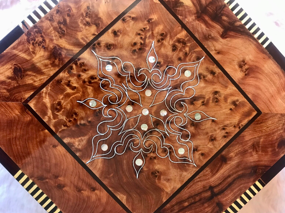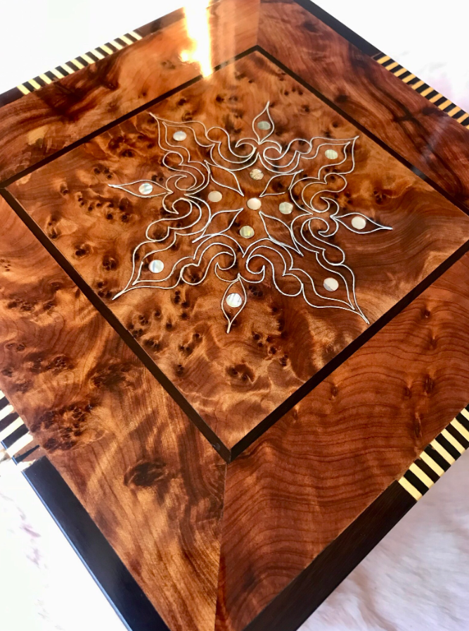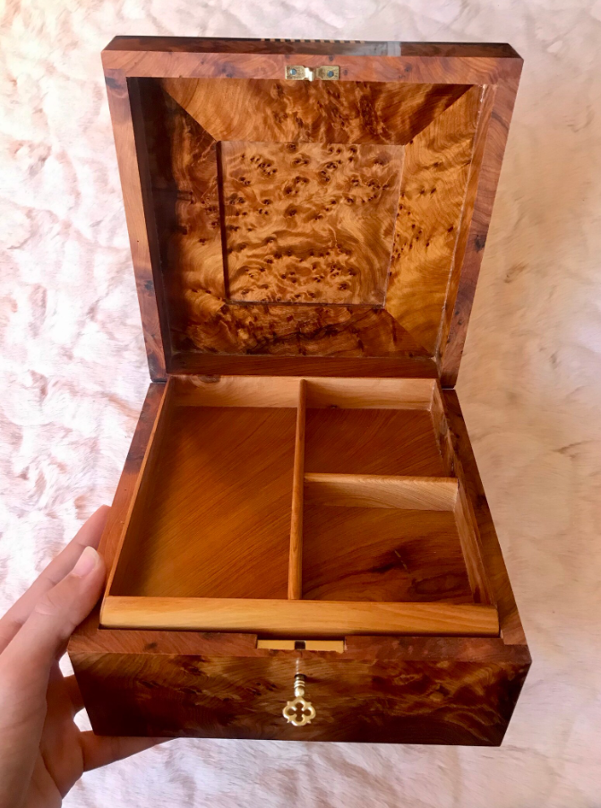 ThuyaCrafts brings you its Thuya wooden box handmade with love by Moroccan artisans, perfect for keeping jewelry, valuable belongings, and important papers. 💡 We ensure that our artisans use the highest quality of the Thuya root burl wood, and take care of the wood humidity by paying attention to the moisture measurement. This process ensures that our Thuya wooden products do not deform over time. ✨ Main Characteristics: Three separated compartments inside, with large storage space underneath (Two Storage Levels). Lockable box with brass key. We accept custom orders (engrave/print text on the lid, leather, or velvet inside wrapping). Dimensions: Length: 20 cm (8 in) Width: 20 cm (8 in) Height: 11 cm (4.3 in) Shipping and Estimated Arrival: It takes 1 day to ship your order after receiving it, plus 3-5 business days using express shipping to deliver your order.