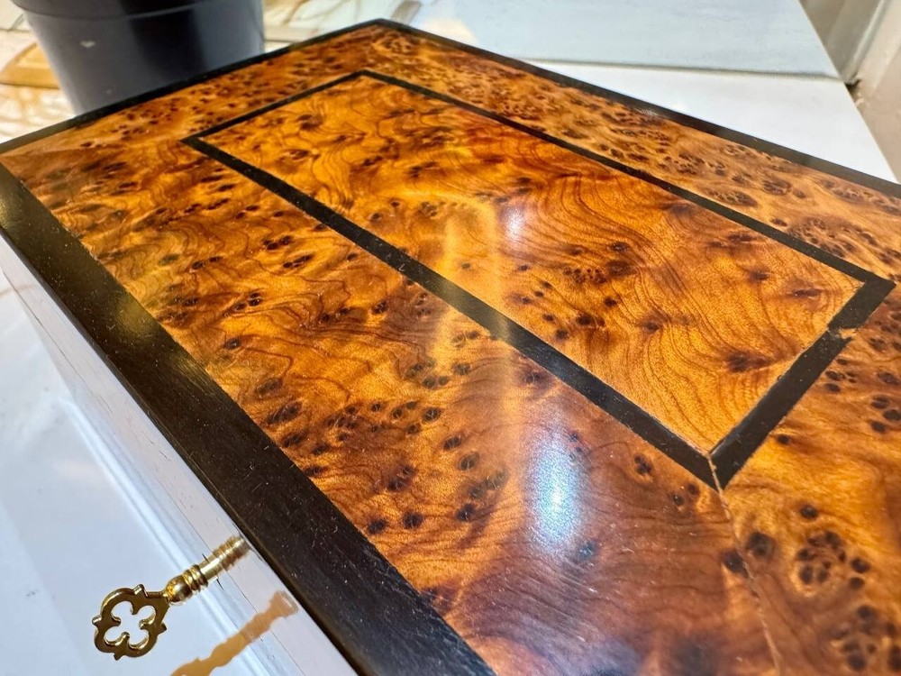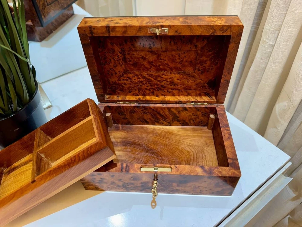 AtlasMuse Handmade Thuya Wooden Box β Crafted with Love by Moroccan Artisans ThuyaCrafts proudly presents its exquisite Thuya wooden box, meticulously handcrafted by skilled Moroccan artisans. Ideal for storing jewelry, cherished belongings, and important documents, this box combines functionality with timeless elegance. π‘ Quality Assured: Each box is crafted using the finest Thuya root burl wood, with careful moisture management to prevent deformation over time. β¨ Key Features: Three separated compartments inside, with spacious storage underneath (Two Storage Levels). Secure lockable design with a brass key. Customization available: engrave/print text on the lid, leather, or velvet interior lining. π Dimensions: Length: 20 cm / 7.9 inches Width: 13.5 cm / 5.3 inches Height: 8 cm / 3.1 inches π Shipping Details: Your order will be shipped within 1 day of purchase, with express shipping delivering in 3-5 business days. Experience the elegance and craftsmanship of AtlasMuse!