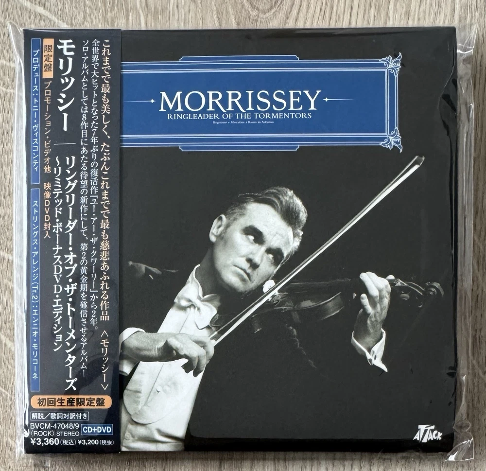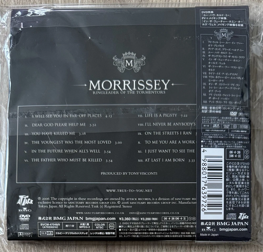 This is a rare Japanese CD DVD of Morrissey's "Ringleader Of The Tormentors," released in 2006 under Attack Records. The CD comes with an OBI, and it’s made in Japan. The album is perfect for fans of The Smiths and Morrissey, and it is a must-have for collectors of rare music. Get your hands on this unique piece of music history today!