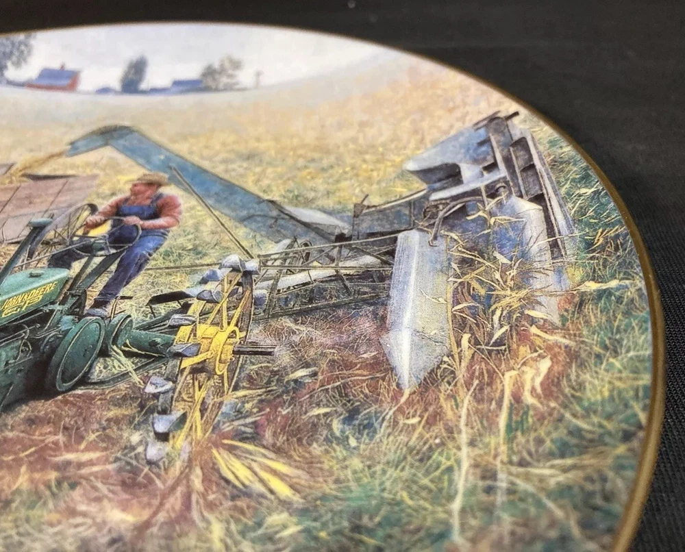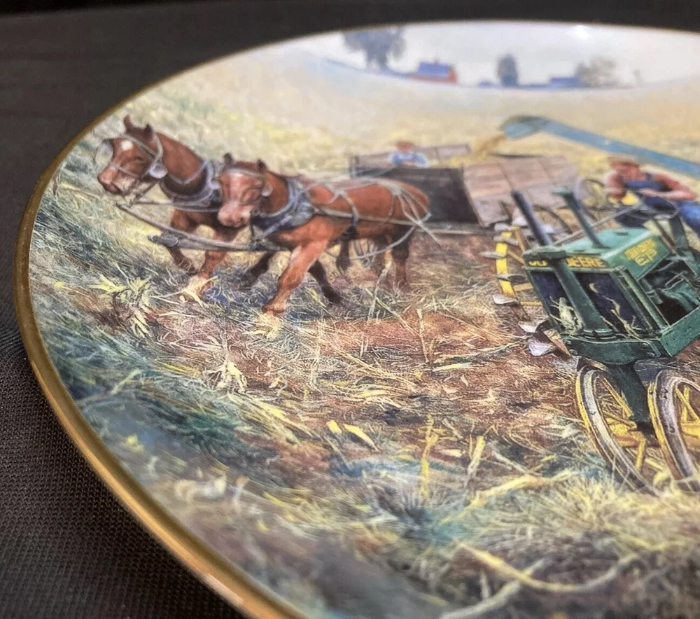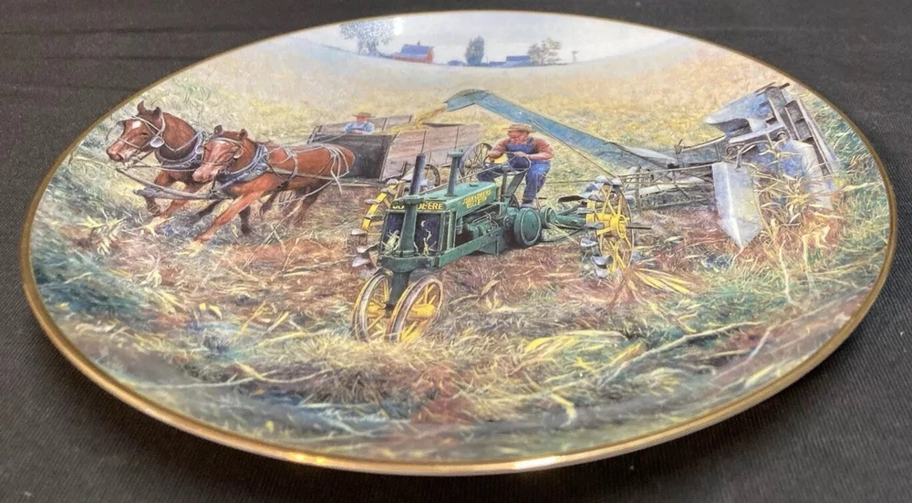 This 8” round collector plate titled "Golden Harvest" by Mort Kunstler captures a nostalgic scene of farming with a John Deere tractor and horses. The plate is pre-owned and comes in good, clean condition with no chips, cracks, or breaks. Please see pictures for details. If you have any questions or concerns, please do not hesitate to contact us. Check out our other items and message us if interested in more than one listing as combining items could save you money on shipping.