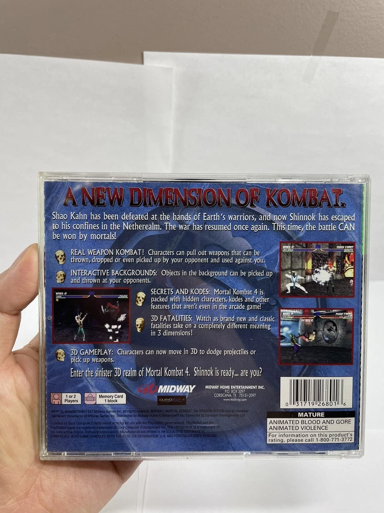 Mortal Kombat 4 (Sony PlayStation 1, 1997) PS1 Complete CIB TESTED! Disc has some scratches but tested and works perfectly. Condition is Good. Shipped with USPS Ground Advantage. NO RETURNS