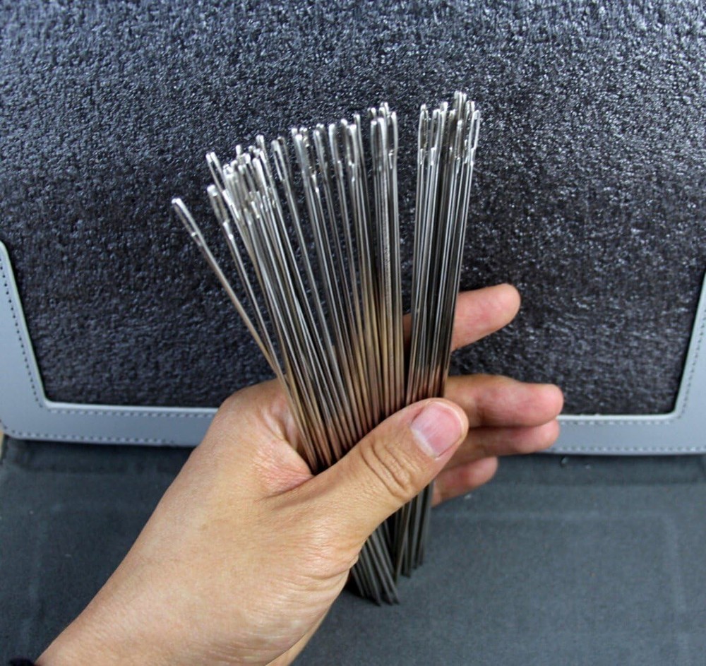 MosBug 50 Pack 6 Inch(15cm) Long Upholster Needles /Long Simple 50 Product Details Product Dimensions: 0.5 x 0.5 x 3.2 inches Item model number: ABCD Is Discontinued By Manufacturer: No Item Weight: 3.2 ounces Material: Stainless Steel Brand: MosBug Color: 50 Pack Point Type: Sharp Item Length: 6 Inches Size: Length is about 6inch/15cm. Diameter of about 1.6 mm.Package including 50 pieces long embroidery needles. Sturdy Material: Straight needle is made of stainless steel, the steel material is polished enough to give a smooth stitch, the needle can weave in two ends, sturdy enough for leather working, thick clothes or shoes repair, vinyl upholstery mend, etc. Long Sewing/Darning Needle: These embroidery needles are Long enough that can be used as darning needles to sew some big items, such as dolls, carpets, quilt and etc. Which can through them very quickly. Apply to: Sewing needle albums, diaries and other Handicraft, for binding, sewing mattresses, upholstery in the car, the act of sewing and puncture paper. Large and long eye allows for sewing twine and other coarse threads. Widely Used: You can use these long needles for arts, crafts, sewing and jewelry making, thin enough for threading beads of various sizes.Use these needles to meet your various needs of arts, crafts, sewing and jewelry making, enough needles for replacement. Package Included: 50 x long sewing needlesWide Application: Sewing needle albums, diaries and other Handicraft, for binding, sewing mattresses, upholstery in the car, the act of sewing and puncture paper. Large and long eye allows for sewing twine and other coarse: Since the needle is very sharp, keep it away from children when using it.