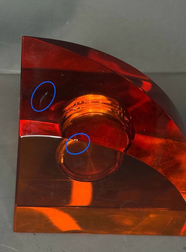 Has a tiny chip and a scratch on the back side shown in pictures