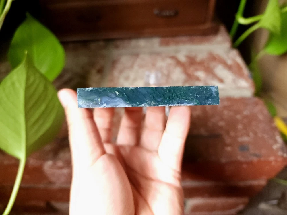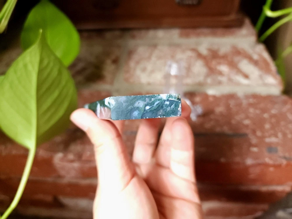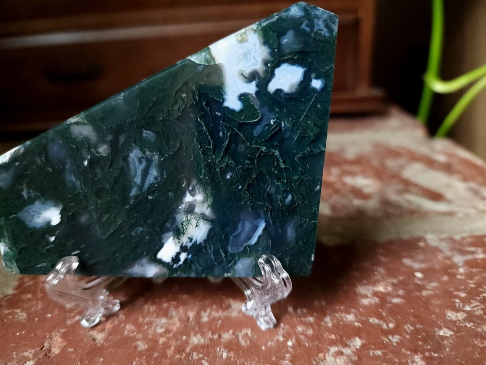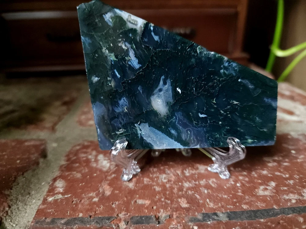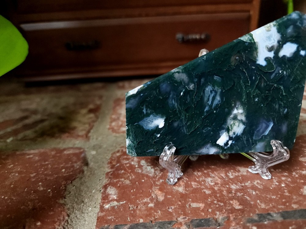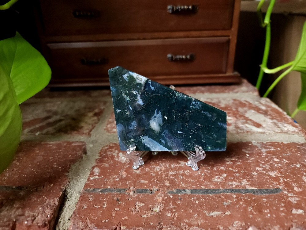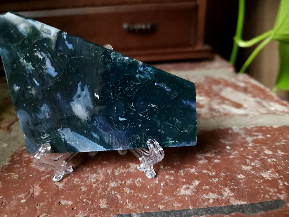 Moss Agate Crystal Slab 3.3 oz 4 inches / 2.2 inches Includes 1 display stand