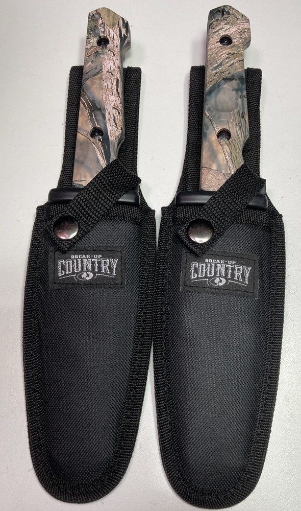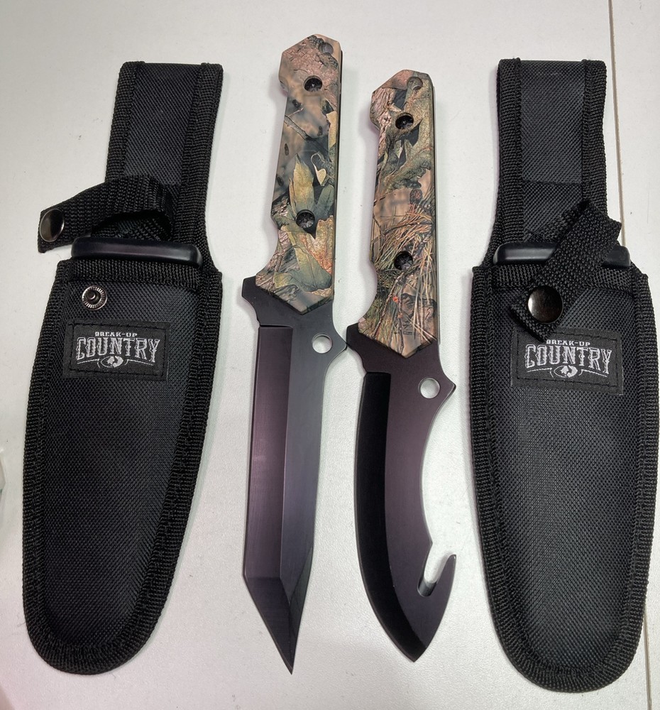 This 2 piece hunting knife set from Mossy Oak-Backup country features fixed blade knives made from durable stainless steel with a black tanto blade type. The full tang construction provides added durability and balance. These knives are perfect for any hunting trip or outdoor adventure. The set includes two knives, each with a unique design that showcases the Mossy Oak camo pattern. The brand is known for its high-quality outdoor products, making these knives a reliable addition to any collection.