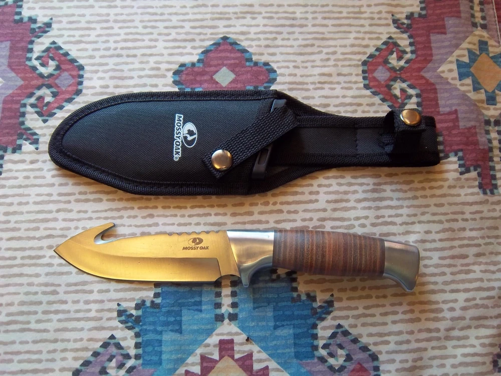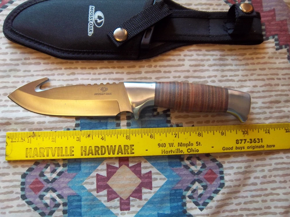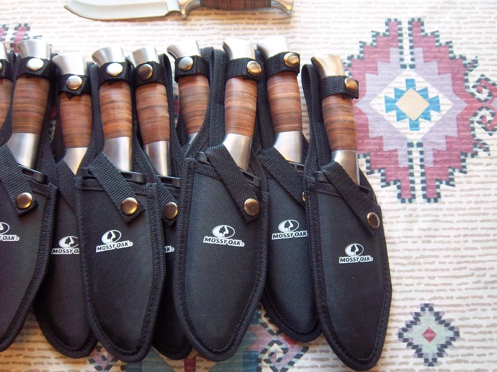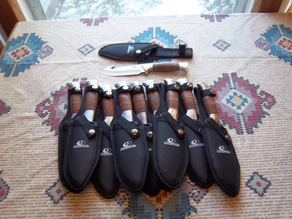 10 new Mossy Oak gut hook knives, 5 " blade, overall length 10 ", leather handle.You get all 10 knives shown in pictures. Shipping cost is $15.00
