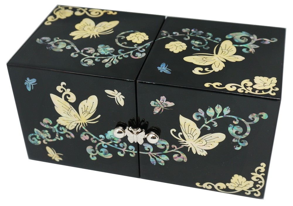 Korean Handmade Mother of Pearl I nlaid Nacre Dual Box 4 Drawer Jewelry Box Ring Necklace Earring Bracelet Brooch Case Storage Organizer Chest [Features] • High quality and Lots of drawer. • Korean traditional natural handicrafts made by a Master, Mother of pearl inlaid wood, Natural lacquer finish. • Butterfly & Flower patterns symbolizes bringing blessings and defeating disasters. • The Best Gift for You and Your Loved Ones. [Specification] • Design : Dual, 4 Drawer • Color : Black • Pattern : Butterfly & Flower • Material : Mother of Pearl(Nacre), Wood, Lacquer, Velvet • Dimensions(LWH) : 6.6 x 3.3 x 3.3 in (168 x 84 x 84 mm) • Country Of Origin: Korea, South [History and Transformation] The traditional Korean Handmade Mother of Pearl crafts is called 'Najeonchilgi'. It symbolizes eternal love and friendship and wishes for the harmony and prosperity of the family. It is made by craftsman through several manual processes. It is also a work of art that Korean kings and noblemen have loved for more than a thousand years, and today, various designs of Najeonchilgi are still being made. [Shipping] We usually use eGS, eBay's official overseas delivery program. • Standard shipping : 10 ~ 25 working days • Expedited shipping : 3 ~ 10 working days Please check if your address is correct. We only ship to the address listed on eBay. Unpredictable things, including weather conditions, shipping problems, customs policies, etc., can take more time than usual. Please understand. [Customer Support] We aim to provide fantastic purchasing experience and service to all customers with excellent Korean handicrafts. If you have any questions or information you need, feel free to send us a message and we'll answer as soon as possible. [Customer Feedback] Your satisfaction is our goal. Please give us feedback regarding our product and service. Your good feedback is valuable to us. Please help us to serve you better. We will do our best to resolve any issue for your complete satisfaction. [Note] Since these crafts are handicrafts, the design, color, decoration, size, etc. may vary, The color and design of mother of pearl may be different or reversed from the photos, and will be sent randomly. Accessories in the photos are not included and the price is per piece. Import duties, taxes, and charges are not included in the item price or shipping cost. These charges are the buyer's responsibility.