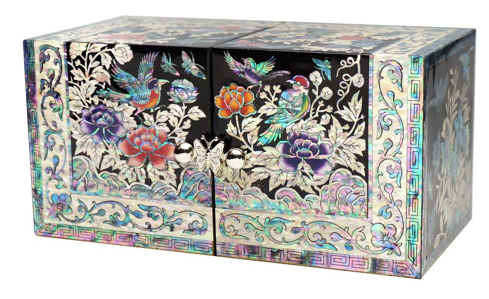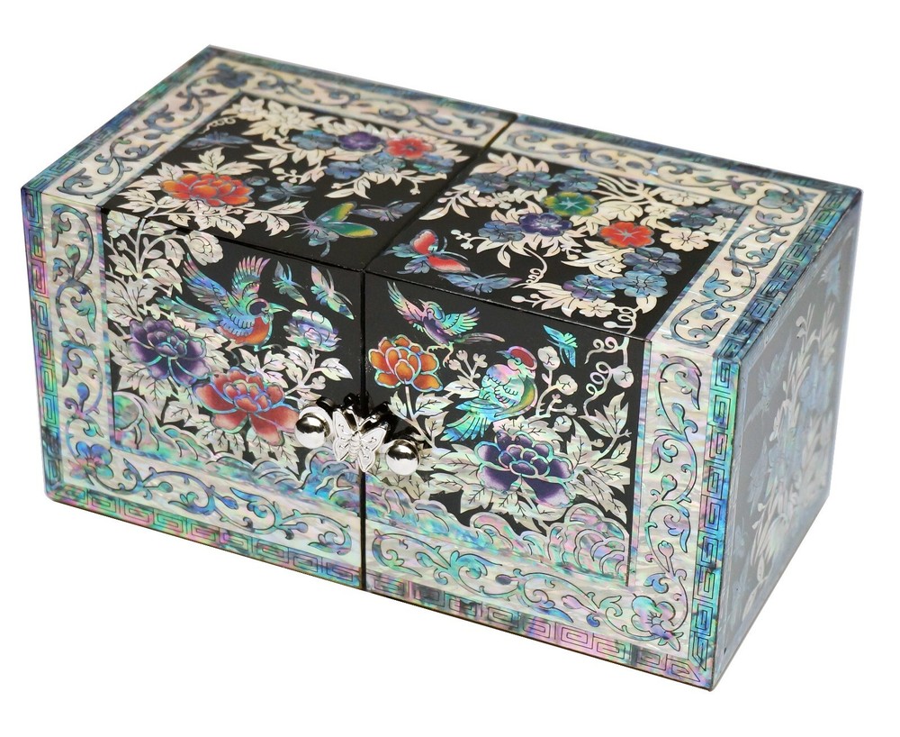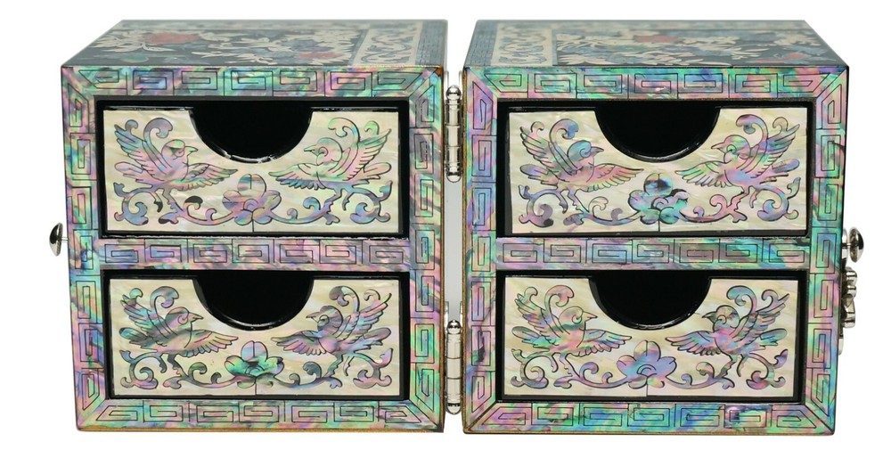Korean Handmade Mother of Pearl I nlaid Nacre Dual Box 4 Drawer Jewelry Box Ring Necklace Earring Bracelet Brooch Case Storage Organizer Chest [Features] • High quality and Lots of drawer. • Korean traditional natural handicrafts made by a master, Mother of pearl inlaid wood, Natural lacquer finish. • Peony flower & Bird patterns symbolize bringing blessings and defeating disasters. • The Best Gift for You and Your Loved Ones. [Specification] • Design: Dual, 4 Drawer • Color: Black • Pattern: Peony flower & Bird, Square • Material: Mother of Pearl (Nacre), Wood, Lacquer, Velvet • Dimensions (LWH): 6.7 x 3.3 x 3.3 in (170 x 85 x 85 mm) • Country of Origin: Korea, South [History and Transformation] The traditional Korean Handmade Mother of Pearl crafts is called 'Najeonchilgi'. It symbolizes eternal love and friendship and wishes for the harmony and prosperity of the family. It is made by craftsman through several manual processes. It is also a work of art that Korean kings and noblemen have loved for more than a thousand years, and today, various designs of Najeonchilgi are still being made. [Shipping] We usually use eGS, eBay's official overseas delivery program. • Standard shipping: 10 ~ 25 working days • Expedited shipping: 3 ~ 10 working days Please check if your address is correct. We only ship to the address listed on eBay. Unpredictable things, including weather conditions, shipping problems, customs policies, etc., can take more time than usual. Please understand. [Customer Support] We aim to provide fantastic purchasing experience and service to all customers with excellent Korean handicrafts. If you have any questions or information you need, feel free to send us a message and we'll answer as soon as possible. [Customer Feedback] Your satisfaction is our goal. Please give us feedback regarding our product and service. Your good feedback is valuable to us. Please help us to serve you better. We will do our best to resolve any issue for your complete satisfaction. [Note] Since these crafts are handicrafts, the design, color, decoration, size, etc. may vary, The color and design of mother of pearl may be different or reversed from the photos, and will be sent randomly. Accessories in the photos are not included and the price is per piece. Import duties, taxes, and charges are not included in the item price or shipping cost. These charges are the buyer's responsibility.