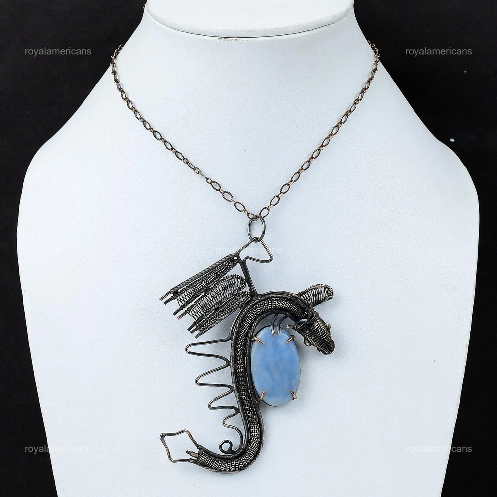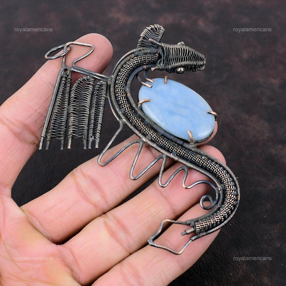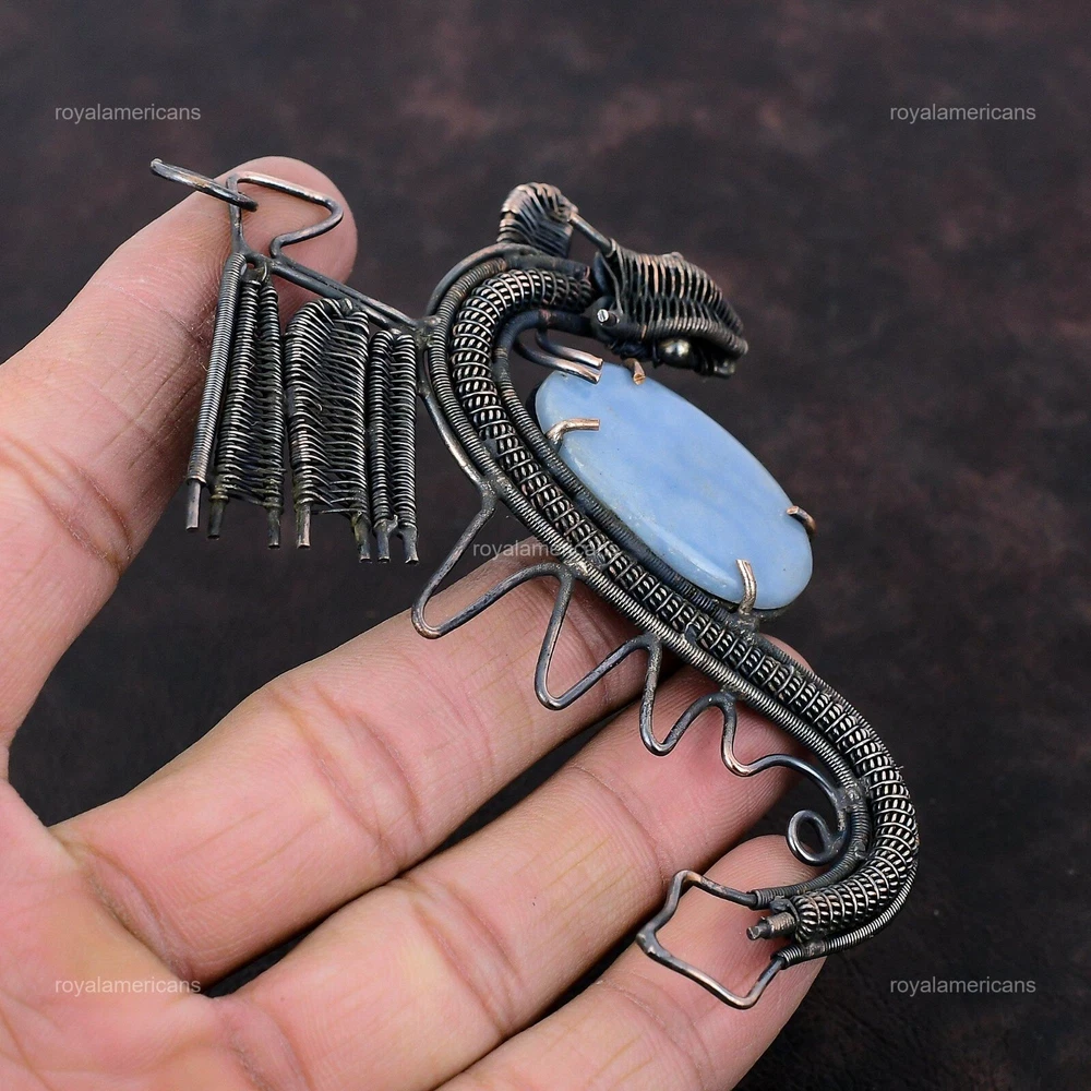Note : Due to the natural formation of this gemstone. Slight variation in design and color are to be expected. Welcome to Royalamericans Mothers day Deal Copper Natural Angelite Dragon Graduation Wife Pendant Jewelry Handmade Pendant, Wire Wrapped Pendant, Wire Wrapped Jewelry, Copper Pendant, Copper Wire Pendant, Wrapped Jewelry, Wire Wrap Pendant, Wire Wrap Jewelry SKU : UFWP-4301 Gemstone : Angelite Stone Shape : As Seen In Picture Metal Purity : Unknown Copper Length : Millimeters Width : Millimeters Copper has been used for jewelry making for thousands of years, dating back to ancient civilizations such as the Egyptians, Romans, and Aztecs. Copper was valued for its beauty, versatility, and durability, and was often used to make everything from jewelry and coins to cookware and tools. In addition to its historical significance, copper jewelry also offers several benefits. Copper is a natural conductor of heat and electricity, which makes it ideal for energy healing and therapeutic purposes. Wearing copper jewelry is believed to have various health benefits, such as improving circulation, reducing inflammation, and boosting the immune system. Some people also believe that copper jewelry has the ability to balance energy and improve mood. For Mother's Day Gift For Father's Day Gift For Promise For Valentine's Day For Halloween Party For Christmas Day Gift For New Year Party For Mom For Her If you can't find the information you need or need some advice for your design? Feel free to contact us. We are fast to reply :) All our work is made by hand with Love and Care in our workshop Thank you so much for visiting and hope you enjoy shopping with us Royalamericans is committed to delivering the best quality sterling silver jewelry to customers. As a handmade jewelry manufacturer, we offer an extensive selection of copper gemstone jewelry that showcases the brilliance of our craftsmanship. We are an experienced handmade jewelry supplier with expertise in embellishing gemstones to suit every style. We offer you the liberty to create your jewelry ensemble with sparkling, earthy, and pure gemstones. Our Talented artisans masterfully handcraft each piece of jewelry you see here. Our pieces are made with genuine gemstones.