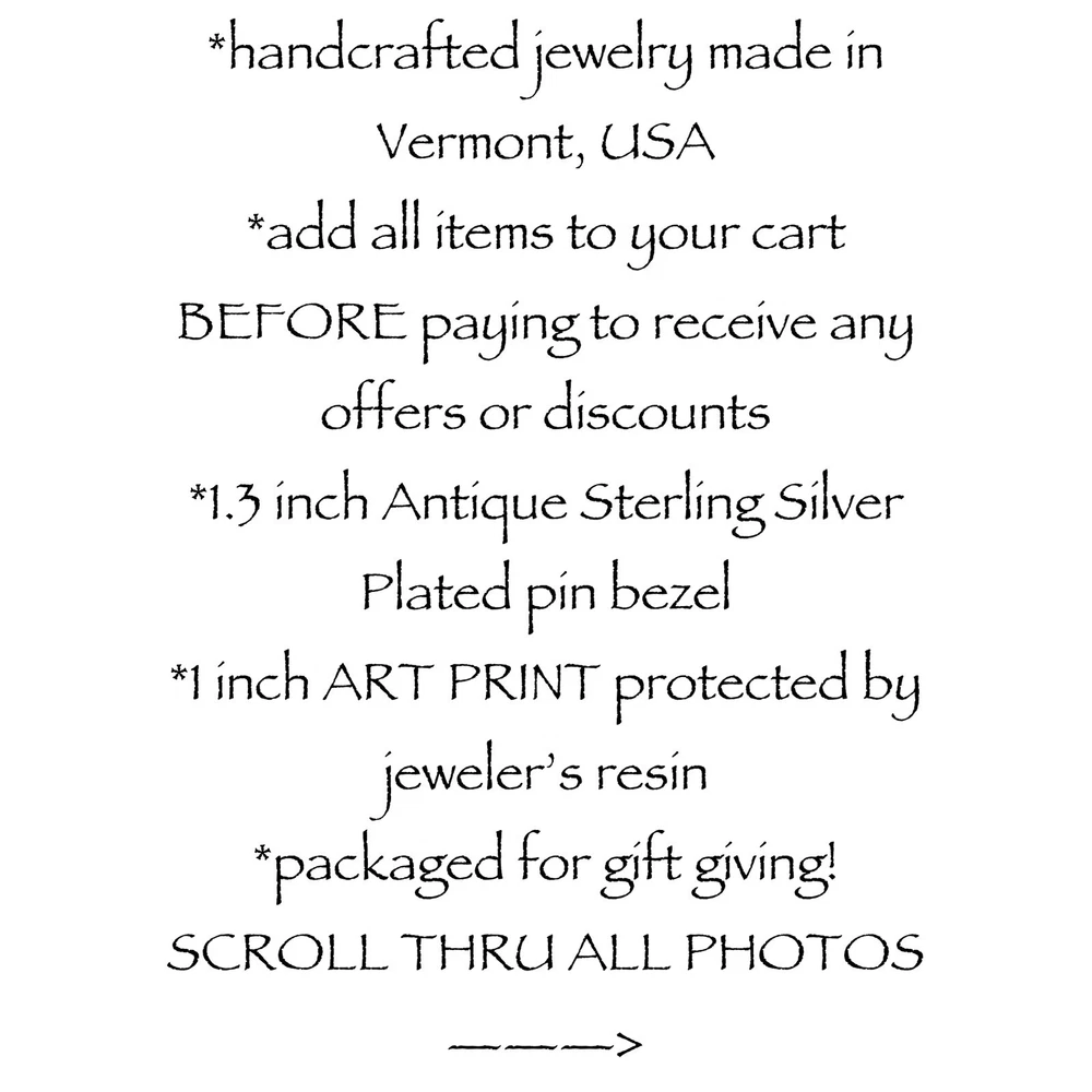 Jeannine’s Jewels Art Print Jewelry is custom handcrafted in my home studio and shipped via USPS from Vermont USA Art Print Brooches are set in a .925 Antique sterling silver plated over pewter (nickel free) Bezel with a pin securely soldered to the back The beautiful piece measures 1.3 inches (a little larger than a US Quarter) The 1 inch circular artwork is printed using archival inks and high quality HP papers and protected with crystal clear professional jewelers resin which beautifully enhances the image below. Each item will come packaged ready for gift-giving. ORDERING MULTIPLE ITEMS ?? please be sure to add all of your selections to your cart before checking out to receive any offers or discounts Jewelry is very water resistant but not completely waterproof, so please remove to swim or shower. Also, please note that jewelry is not appropriate for small children due to choking hazard. Thanks for looking! Use Ebay messenger for any questions and have a great day!!