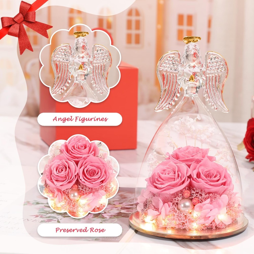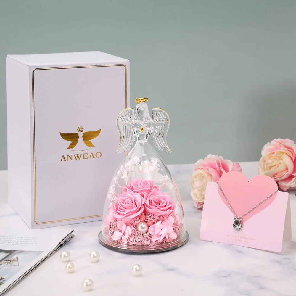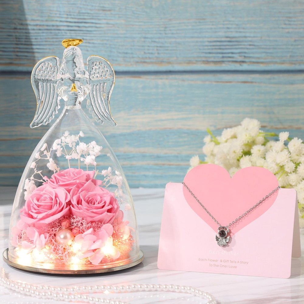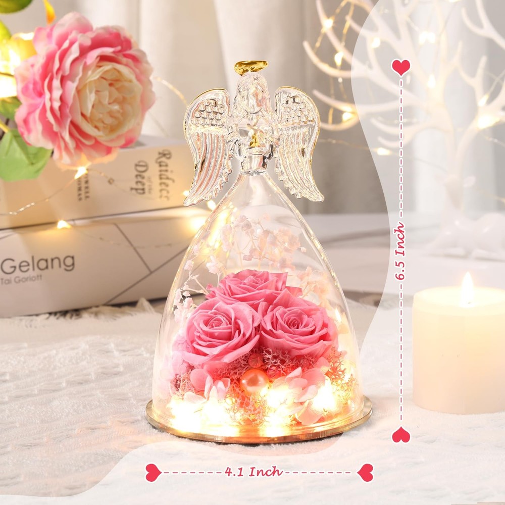 Valentines Day Gits for Her Preserved Real Rose in Angel Glass Preserved Flowers Birthday Gifts for Mom, Angel Gifts for Best Friend, Rose Gift for Her, Valentines DESIGNED FOR LOVE - Angel statue made of clear glass with golden outline drawing wings, halo and folded palms. Preserved flower is made of natural Japanese rose with unique preservation process, most keep the same color, shape and feeling of fresh cut flower, which can last 3-5 year, you just need to put the angel gifts in a cool place. Do not place in direct sunlight and humid places. Unique Preserved Rose Flower Gifts For Her - The upgraded angel rose has an LED light embedded in the center of the rose, full of a romantic atmosphere. Our angel figure preserved flowers are handmade, with a variety of flowers, combined with the unique appearance of angels, delicate and surprise.It is the perfect decoration for candlelight dinners, weddings, parties, living rooms, bedrooms, offices, coffee shops. LARGE SIZE & WHAT IS INCLUDED - The diameter of the angel is 4.10 inches and the height is 6.40 inches. The packaging contained a glass angel figurine, a angel i Love You Necklace, a beautiful gift box, and a great greeting card. Our three sunflower roses guardian angel figurines come with everything needed to present it as a gift, you don't have to buy wrapping paper or a card. I Love You Angel Pendant Necklace - The projection necklace uses the latest nano-projection technology to express "I love you" in 100 different languages, illuminating the angel pendant with light, mapping out 100 languages of I love you, which is romantic and can show your lover how much you love her. Unique Gift Ideas for Women - Beautifully Packaged. Arrives completely assembled in a high quality, reusable gift box, with a Delicate heart greeting card. You do not have to worry about a thing! We make gift giving fun and easy! Elegantly designed and filled with thoughtful gifts! Make Her Feel Pampered on Christmas, her birthday, or anniversary with this three roses guardian angel figurines luxury gift box for women!