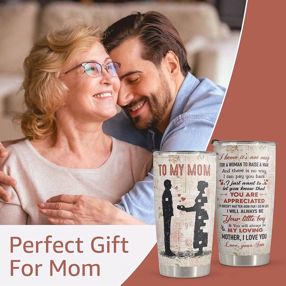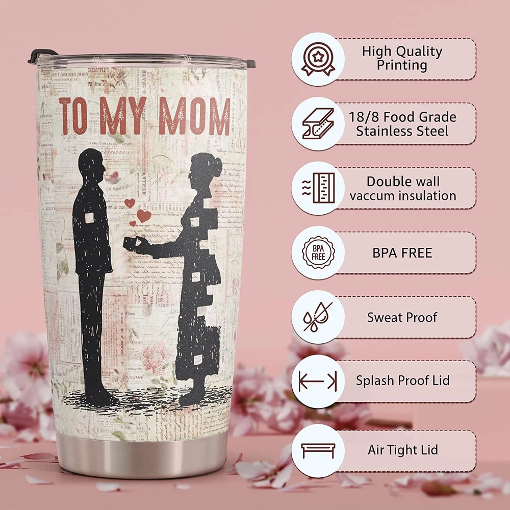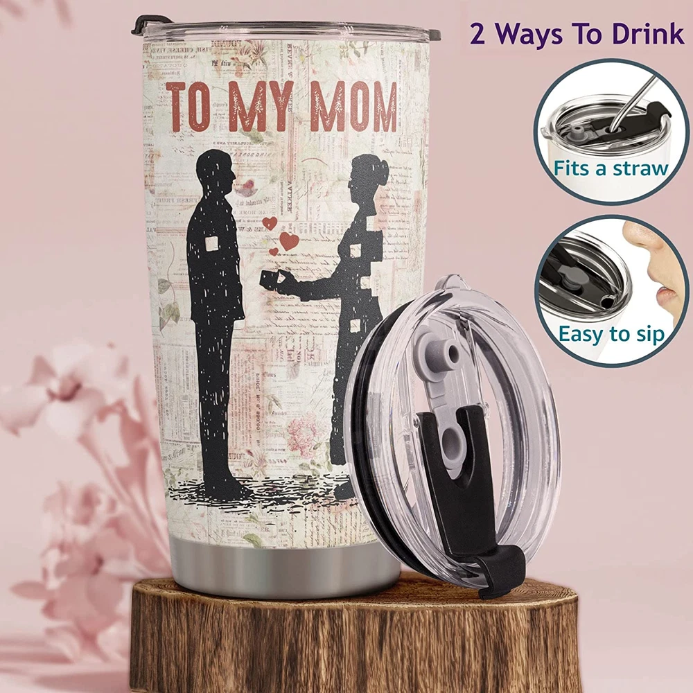 π THOUGHFUL TUMBLER π For a gift feels extra thoughtful and special because it can only come from you. π UNIQUE MOTHER'S DAY GIFT FOR MOM π Our high-quality Tumbler with heart-touching design will certainly be the perfect gift to your Mother/ Mother-in-law/ Stepmother, who always cherishes and supports you in every situation. Presenting this gift to her as a sincere thanks for making your everyday wonderful. In this way, you can express how you're grateful for the love and happiness she brings to your life. π TEMPERATURE RETENTION - Featuring a leakproof cap and made from food-grade stainless steel and BPA-free components, our vacuum insulated flask can keep your beverages hot or cold, at just the right temperature for up to 9 hours, depending on the outside temperature. π PREMIUM MATERIAL - The cup body is made from 18/8 stainless steel, so this tumbler is durable, unbreakable, rust-resistant, and doesn't transfer the flavor of your drinks. The BPA-free clear lid that seals the cup tightly keeps spills under control and allows you to see inside. π FITS IN MOST CUP HOLDERS - Lightweight, compact, fits most car cup holders. Toss your bottle in your bag without worrying about spills, drips, or condensation. Product Description PERFECT MOTHERS DAY GIFTS Surprise her with a high-quality and beautiful tumbler design with meaningful sayings of motherhood. It will also be an extremely unique Mothers Day gifts, birthday gift, Christmas gift, Thanksgiving gifts for mom from daughter, daughter-in-law, son, son-in-law. BEAUTIFUL GIFT PACKAGING Best gifts for mom who have everything and Birthday mom gift from daughter and son. Whether your Stepmother, Mother in law, Grandmother, or an Expecting Mom to be for her baby showerβ¦ No matter the occasion, Delight her with the meaningful message and beauty of this unique present VACUUMED INSULATED TUMBLER Adopting double-layer vacuum insulation technology, this insulated stainless steel water bottles can keep your beverage hot for 3 hours and cold for 9 hours, enabling you to warm up a chilly morning with a hot drink or enjoy a cold drink after exercise. Occasion Mother's Day, Valentine's Day, Birthday, Christmas Mother's Day, Valentine's Day, Birthday, Christmas Mother's Day, Valentine's Day, Birthday, Christmas Father's Day, Valentine's Day, Birthday, Christmas Mother's Day, Valentine's Day, Birthday, Christmas Leak-Proof Lid β β β β β Capacity 20oz 20oz 20oz 20oz 20oz Material 18/8 Stainless Steel 18/8 Stainless Steel 18/8 Stainless Steel 18/8 Stainless Steel 18/8 Stainless Steel Vacuum Insulated β β β β β Sweat Proof β β β β β